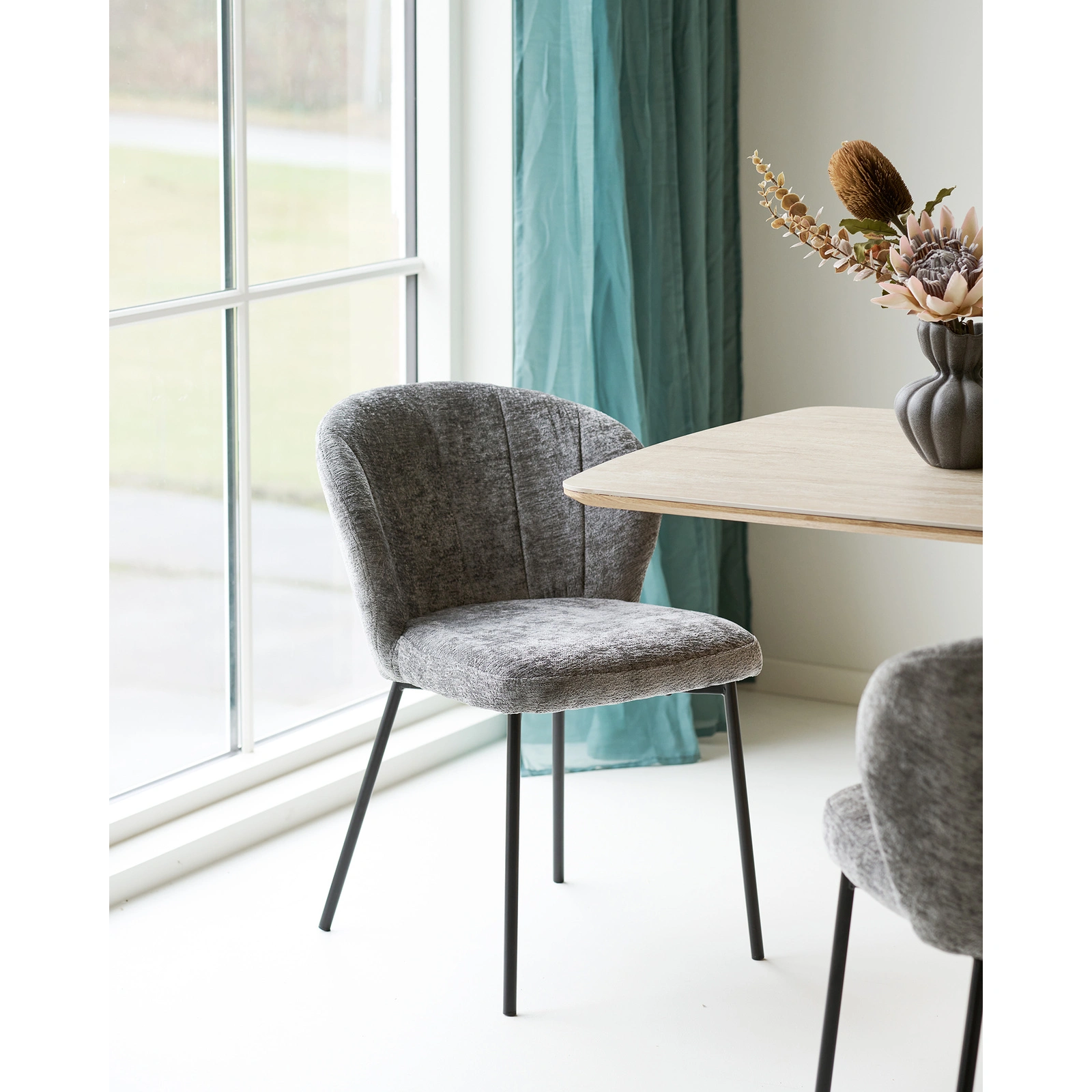 Krzesło Roanne marki House Nordic to nowoczesne, szare krzesło tapicerowane na czarnych, wysokich nogach, zaprojektowane z myślą o wygodnym użytkowaniu przy stole. Miękkie siedzisko z profilowanym oparciem zapewnia komfort podczas dłuższych posiłków, a kompaktowe wymiary (szerokość 59 cm, głębokość 66 cm, wysokość 80 cm) sprawiają, że świetnie sprawdzi się w jadalni, salonie lub kuchni.