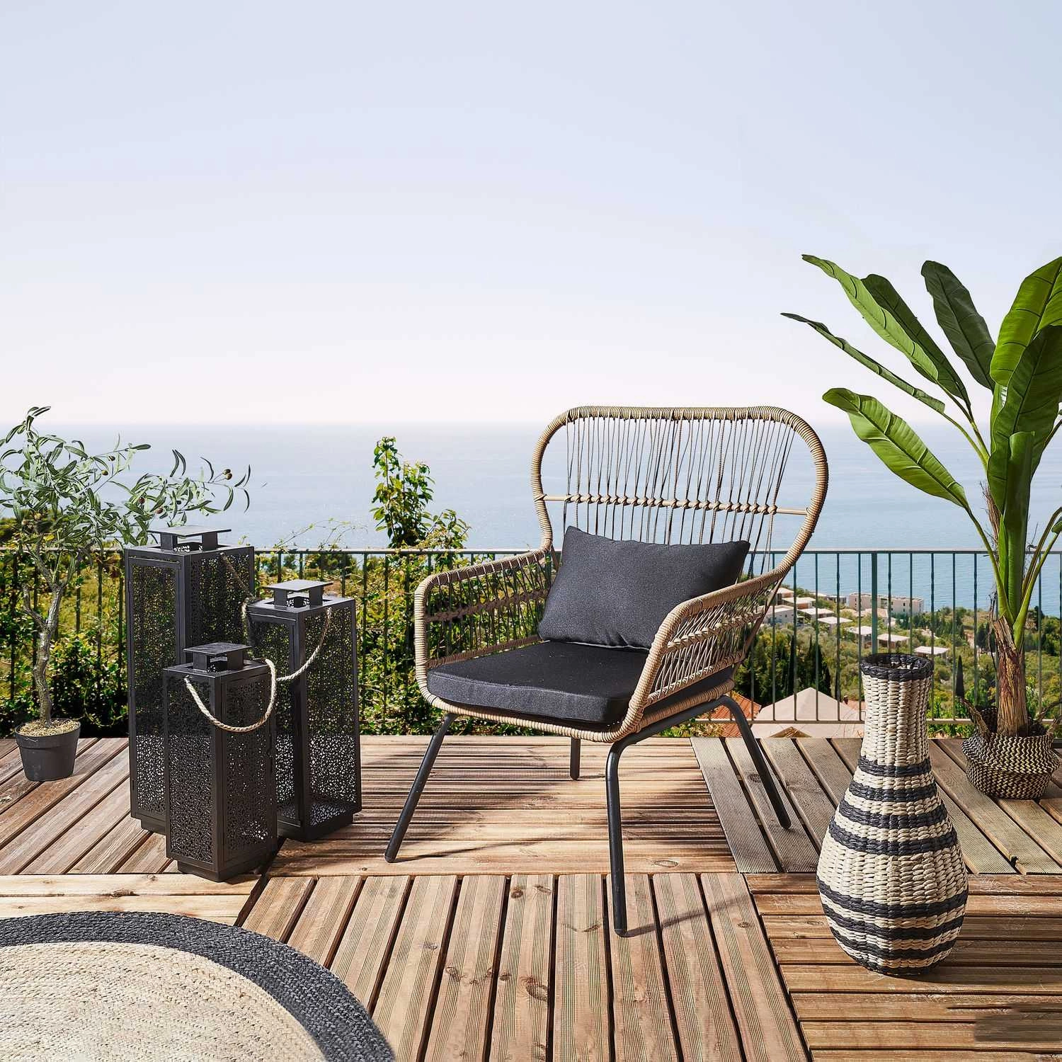 Krzesło z podłokietnikami Surabaya Arm to odpowiedź na cieszącą się dużym zainteresowaniem linie Surabaya. To niezwykła kolekcja, która stała się nieodłącznym elementem słonecznych dni. Odpoczynek na Twoim balkonie, tarasie lub w ogrodzie może stać się jeszcze przyjemniejszy. Wykonanie z trwałego, techno rattanu sprawi, że krzesło wniesie do przestrzeni świeżej atmosfery nawiązującej do stylu boho, utożsamianego z wygodą, latem oraz wakacyjnym luzem. Dodatkowy komfort podczas odpoczynku zapewnią poduszki obite czarną tkaniną - na siedzisku i oparciu.