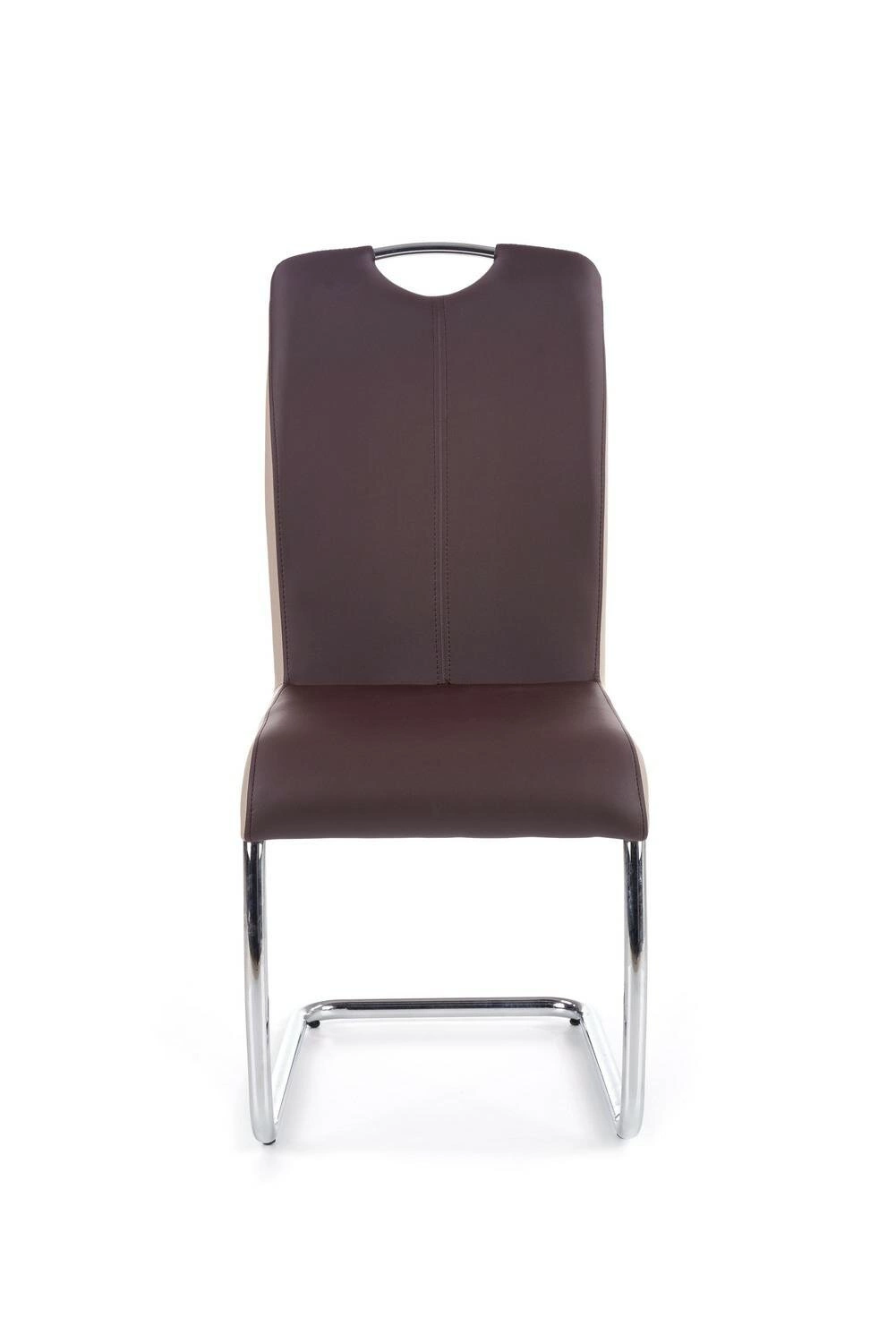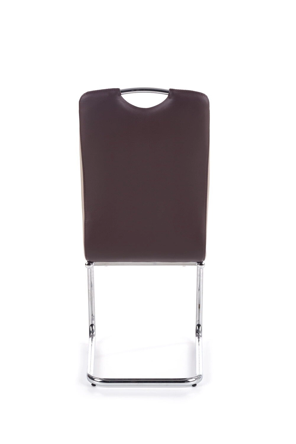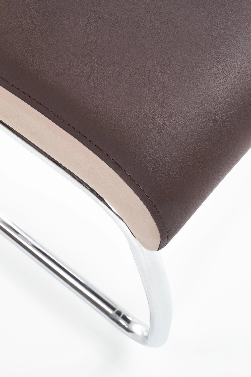 Oparcie tego wyjątkowego krzesła zostało starannie tapicerowane ekoskórą, nadając mu nie tylko przyjemny wygląd, ale również podkreślając jego trwałość. Kolorystyka w odcieniach ciemnego brązu i beżu tworzy subtelny kontrast, dodając uroku każdemu wnętrzu.