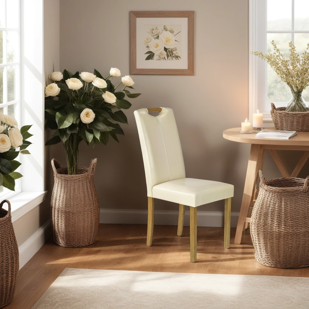 Kolorystyka krzesła Roca to subtelne połączenie bukowego drewna litego z kremową eco skórą, tworzące harmonijną kompozycję. Klasyczny design tego krzesła sprawia, że doskonale wpisuje się w różnorodne aranżacje wnętrz, dodając im szlachetności i stylu. Tapicerowane siedzisko i oparcie gwarantują wygodę użytkowania, tworząc przyjemne miejsce do odpoczynku i relaksu.