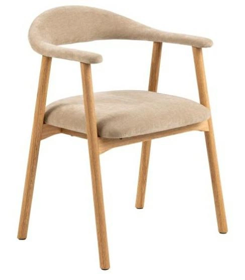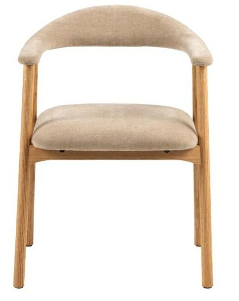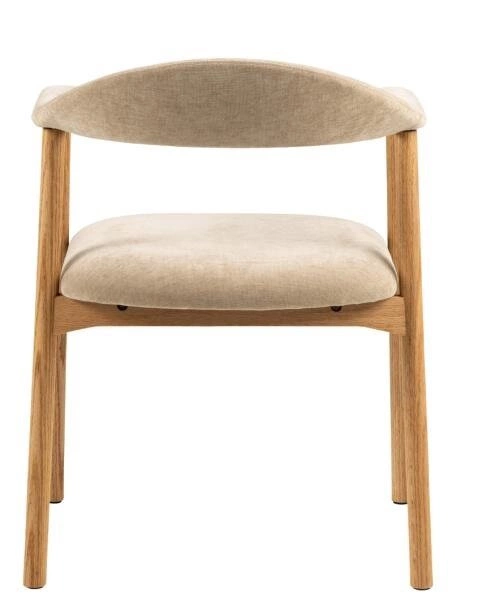 Tapicerowane siedzisko i oparcie w miękkiej tkaninie o kolorze beżowym Danny beige 3 dodają krzesłu uroku i przytulności. Ciekawa tekstura i gruby splot materiału doskonale komponują się z naturalnymi słojami drewna nóg, tworząc harmonijne połączenie.