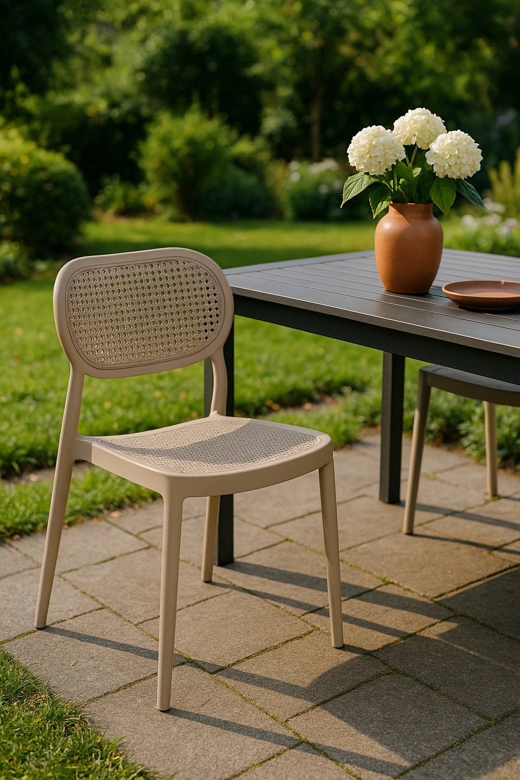 Krzesło ogrodowe Bilto taupe marki Intesi to połączenie stylu boho, funkcjonalności i wytrzymałości. Wykonane z trwałego polipropylenu, o wymiarach 80×48×48 cm, zachwyca naturalnym beżowym kolorem i ażurową formą, która podkreśla lekkość konstrukcji. To krzesło do ogrodu oraz na taras lub balkon, łatwe w czyszczeniu i odporne na czynniki zewnętrzne, stanowi praktyczne rozwiązanie do codziennego relaksu na świeżym powietrzu.