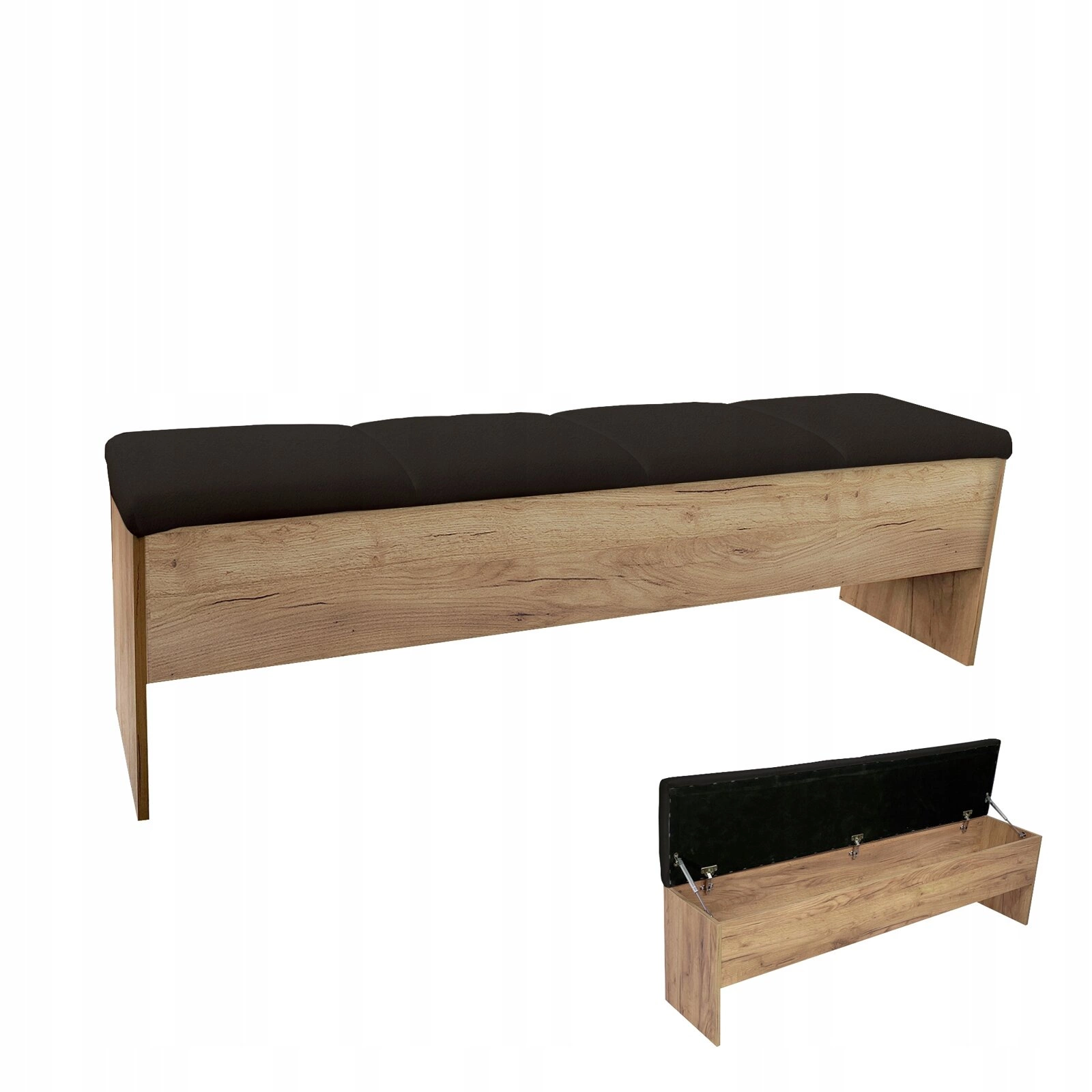Ławka tapicerowana ze schowkiem Intesi 164 cm dąb/czarny to połączenie funkcjonalności i elegancji, które doskonale sprawdzi się w przedpokoju, sypialni lub garderobie. Obszerny schowek ukryty pod miękkim, czarnym siedziskiem z matowej skóry ekologicznej pozwala na wygodne przechowywanie dodatków, butów lub tekstyliów, a naturalny odcień dębu uzupełniony czernią nadaje meblowi ponadczasowy, skandynawski charakter. Szerokość 164,5 cm zapewnia komfort użytkowania nawet w większych przestrzeniach.