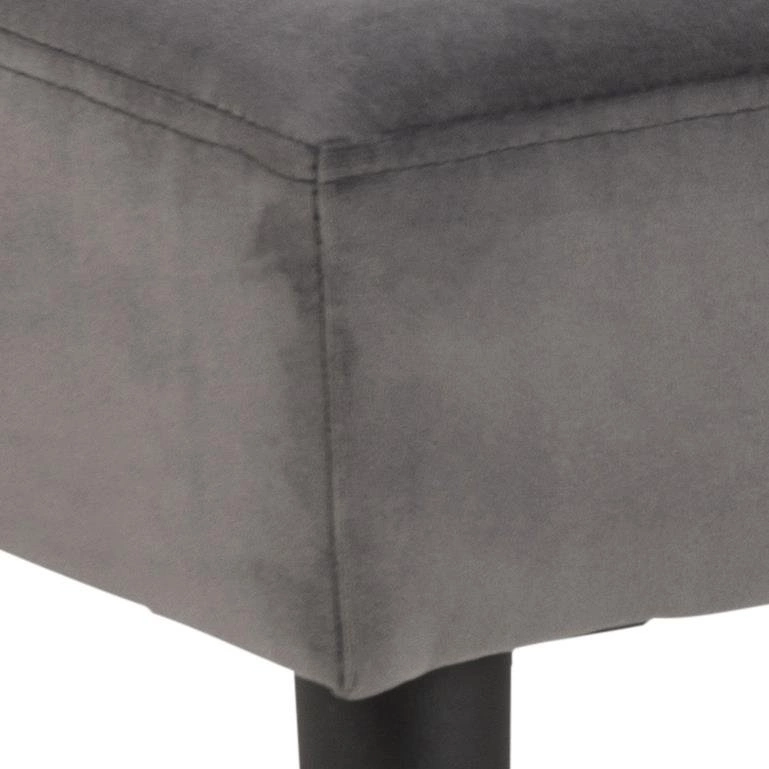 Ławka do przedpokoju Glory to wygodne siedzisko nie tylko pomagające w zakładaniu butów. Mebel wyposażony został w niezwykle przyjemne, miękkie siedzisko zrobione z pianki, obite przyjemną w dotyku welurową tkaniną w odcieniu szarości. Ciekawe pikowania na siedzisku dodaje ławce charakteru stylu glamour. Tkanina użyta do ibicia mebla to VIC dark grey 28. Całość osadzona została na wysokich, zwężających się nogach z metalu malowanego proszkowo. Ławka może być siedziskiem w poczekalni, ławką dla dzieci lub ławką w hotelowym lobby.