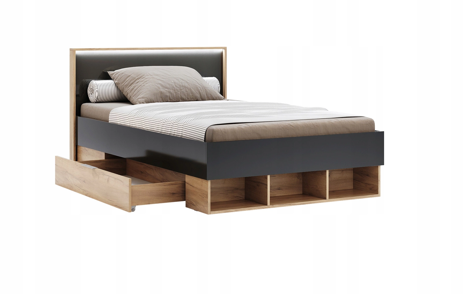 Model Lana to nie tylko łóżko młodzieżowe o nowoczesnym wyglądzie, ale także praktyczne rozwiązanie do organizacji przestrzeni. Dwie wysuwane szuflady pozwalają wygodnie przechowywać pościel, poduszki czy sezonowe tekstylia, pomagając utrzymać porządek nawet w mniejszych pokojach. Oświetlenie LED w zagłówku zapewnia subtelne światło, idealne do wieczornego odpoczynku, a jednocześnie tworzy przytulną atmosferę bez konieczności zapalania głównego światła.