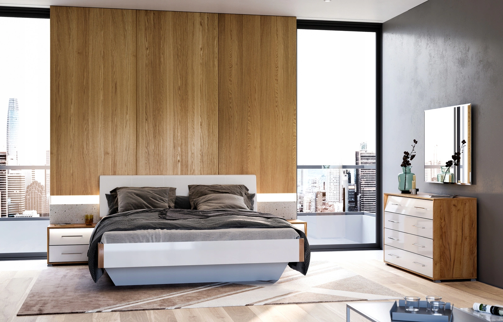 - Nowoczesny design – połączenie bieli i dębu pasuje do większości współczesnych sypialni