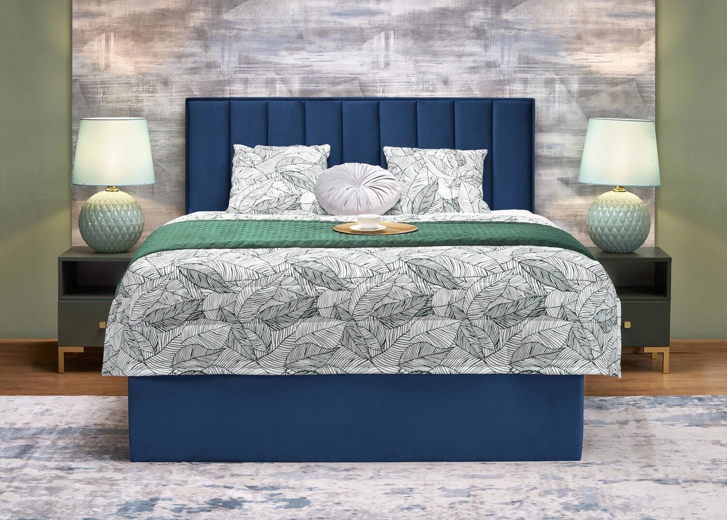 Łóżko tapicerowane Renji 160x200 to nowoczesny mebel do sypialni, który łączy w sobie elegancję granatowej, aksamitnej tkaniny z praktyczną funkcjonalnością pojemnika na pościel. Szerokość 162 cm oraz powierzchnia spania 160x200 cm sprawiają, że model ten jest idealny jako łóżko dwuosobowe, zapewniające wygodę na co dzień. Wysokie wezgłowie, przyjemna w dotyku welurowa tkanina oraz solidna konstrukcja czynią z Renji wyjątkowy akcent w nowoczesnej aranżacji sypialni.