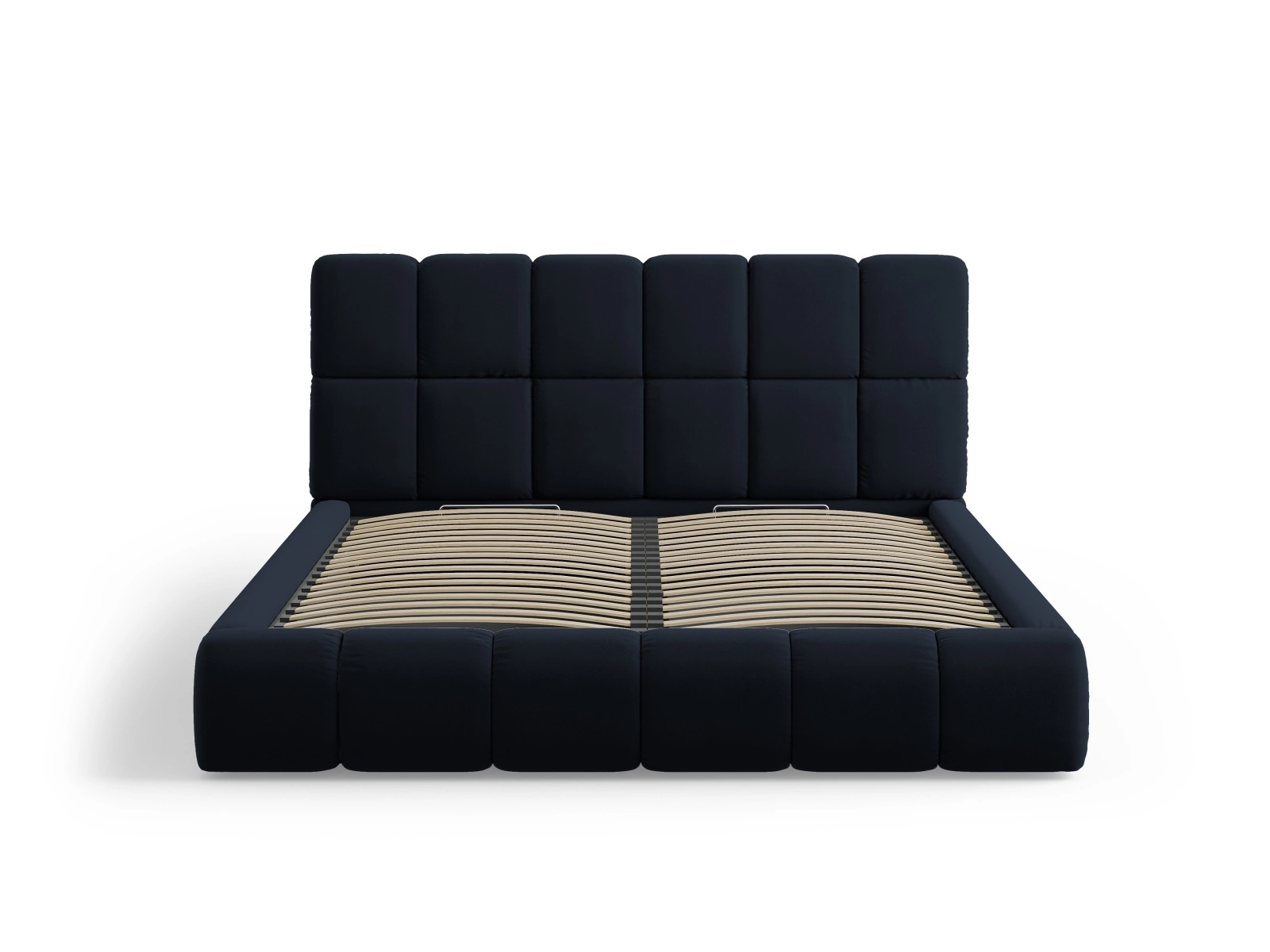 Łóżko tapicerowane Bellis granatowe 180x200 to propozycja dla osób poszukujących eleganckiego, a jednocześnie praktycznego łóżka do sypialni. Wyróżnia je miękka, aksamitna tkanina welwetowa w głębokim granatowym kolorze, wygodny stelaż w zestawie oraz duży pojemnik na pościel, który pomoże zadbać o ład i porządek w przestrzeni do odpoczynku. Powierzchnia spania 180x200 cm zapewni wygodę zarówno jednej, jak i dwóm osobom, a stabilna konstrukcja wytrzyma obciążenie aż do 300 kg.