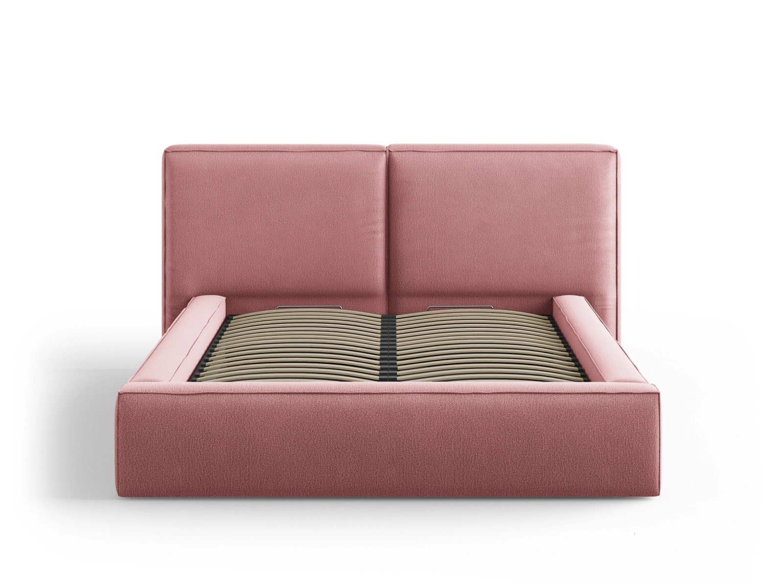 Łóżko Jodie II to nowoczesne łóżko tapicerowane do sypialni w stylu glamour, o powierzchni spania 180x200 cm. Wyróżnia się eleganckim różowym kolorem, przyjemną w dotyku tkaniną oraz praktycznym pojemnikiem na pościel. Solidny stelaż w zestawie i maksymalne obciążenie do 300 kg zapewniają bezpieczeństwo i trwałość użytkowania, a dekoracyjne wykończenie nadaje wnętrzu niepowtarzalny charakter.