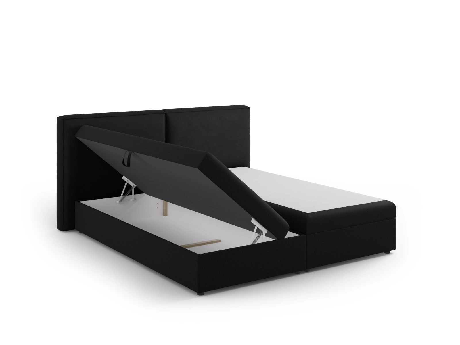 Jodie to doskonały wybór dla osób szukających łóżka dwuosobowego z pojemnikiem, które sprawdzi się zarówno w domowej sypialni, jak i eleganckim apartamencie czy pokoju gościnnym. Czarna tapicerka podkreśla nowoczesny charakter wnętrza, a niewielka wysokość nóżek (2,5 cm) sprawia, że łóżko prezentuje się lekko i subtelnie. Dzięki przemyślanej konstrukcji i wykończeniu łatwo dopasujesz je zarówno do aranżacji minimalistycznych, jak i tych inspirowanych stylem glamour.