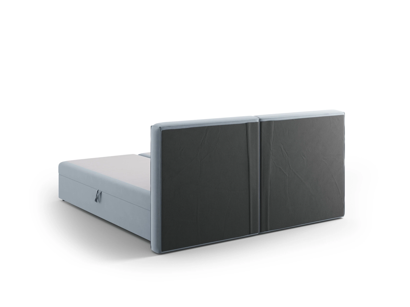 Łóżko Jodie to nowoczesne łóżko tapicerowane 180x200 cm w wyrazistym niebieskim kolorze, wykonane z tkaniny welwetowej i litego drewna sosnowego, idealne do sypialni w stylu glamour. Wyróżnia się aksamitnym wykończeniem, wysokim zagłówkiem oraz praktycznym pojemnikiem na pościel, który zapewnia dodatkową przestrzeń do przechowywania. Dzięki solidnej konstrukcji i eleganckiemu designowi, to łóżko dwuosobowe stanowi wyjątkową ozdobę każdej nowoczesnej sypialni.