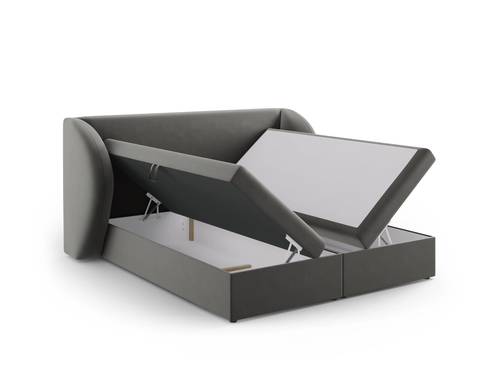 Łóżko Miley to nowoczesne łóżko tapicerowane o powierzchni spania 180x200 cm, wykonane z litego drewna sosnowego i pokryte miękką, szarą tkaniną welurową. Model wyposażono w praktyczny pojemnik na pościel oraz solidny stelaż w zestawie. Doskonałe do sypialni utrzymanej w stylu glamour, łączy w sobie elegancję, funkcjonalność i komfort użytkowania na co dzień.