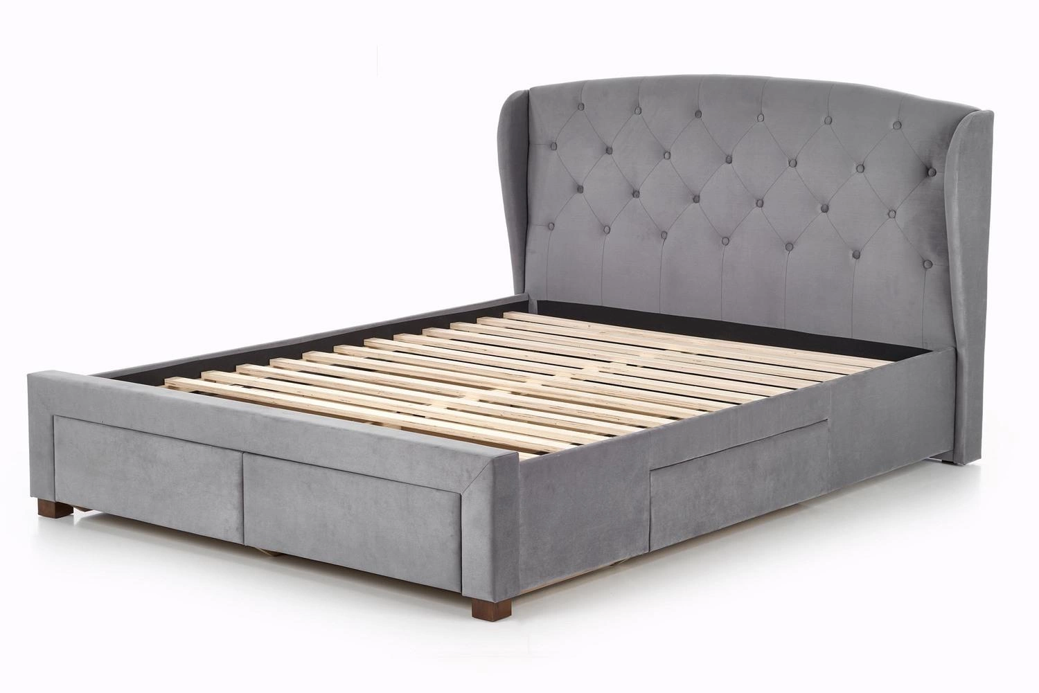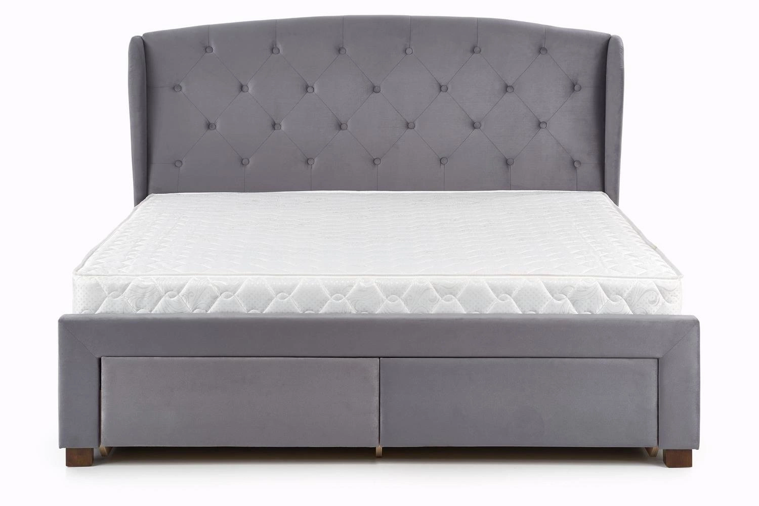 Łóżko tapicerowane Saba 160x200 popielate to propozycja dla osób poszukujących elegancji i funkcjonalności w sypialni. Wysokie, pikowane wezgłowie, cztery pojemne szuflady na pościel i solidna konstrukcja z litego drewna łączą styl glamour z praktycznością. Szeroka powierzchnia spania 160x200 cm zapewnia komfortowy wypoczynek dla dwóch osób.