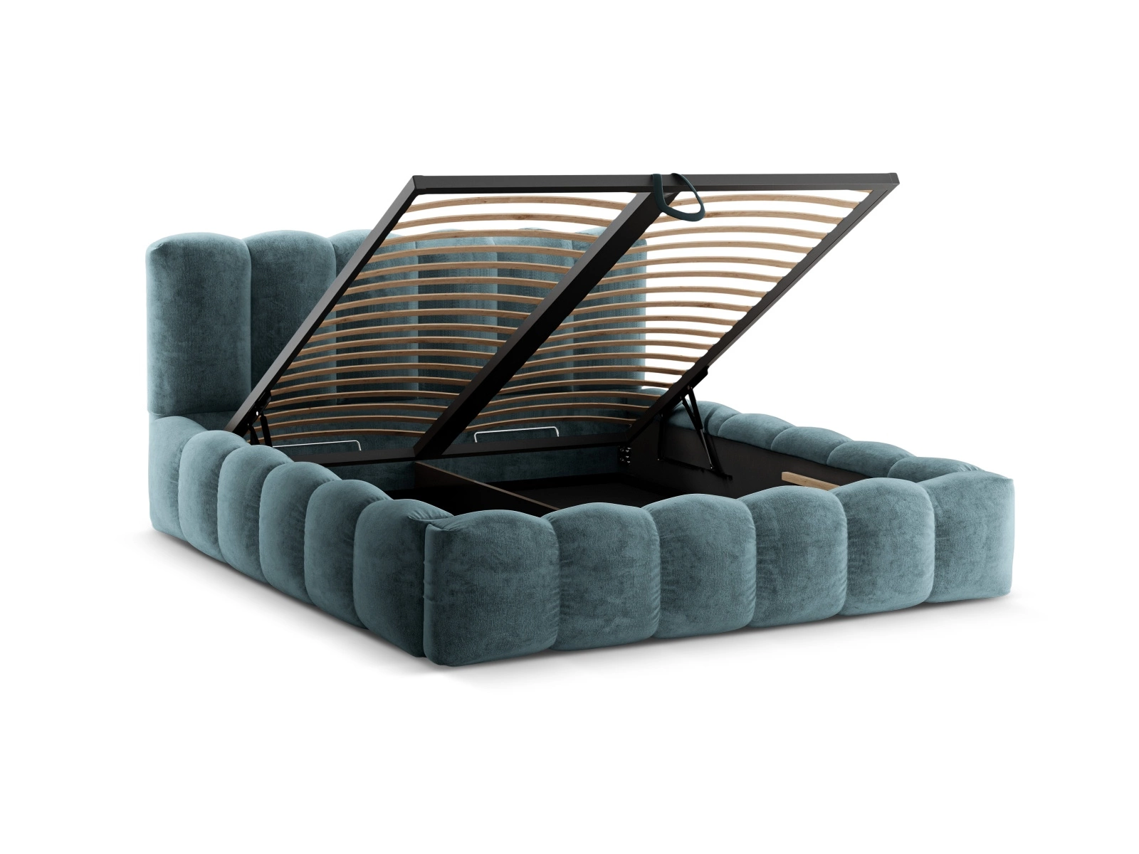 Łóżko do sypialni Lupine wyposażone jest w praktyczny pojemnik na pościel, który umożliwia łatwe przechowywanie kołder, poduszek czy sezonowych tekstyliów. Dzięki temu zyskujesz dodatkową przestrzeń i utrzymujesz porządek bez konieczności kupowania dodatkowych szafek czy skrzyń. Stelaż w zestawie zapewnia odpowiednią wentylację materaca i stabilne podparcie dla Twojego snu.