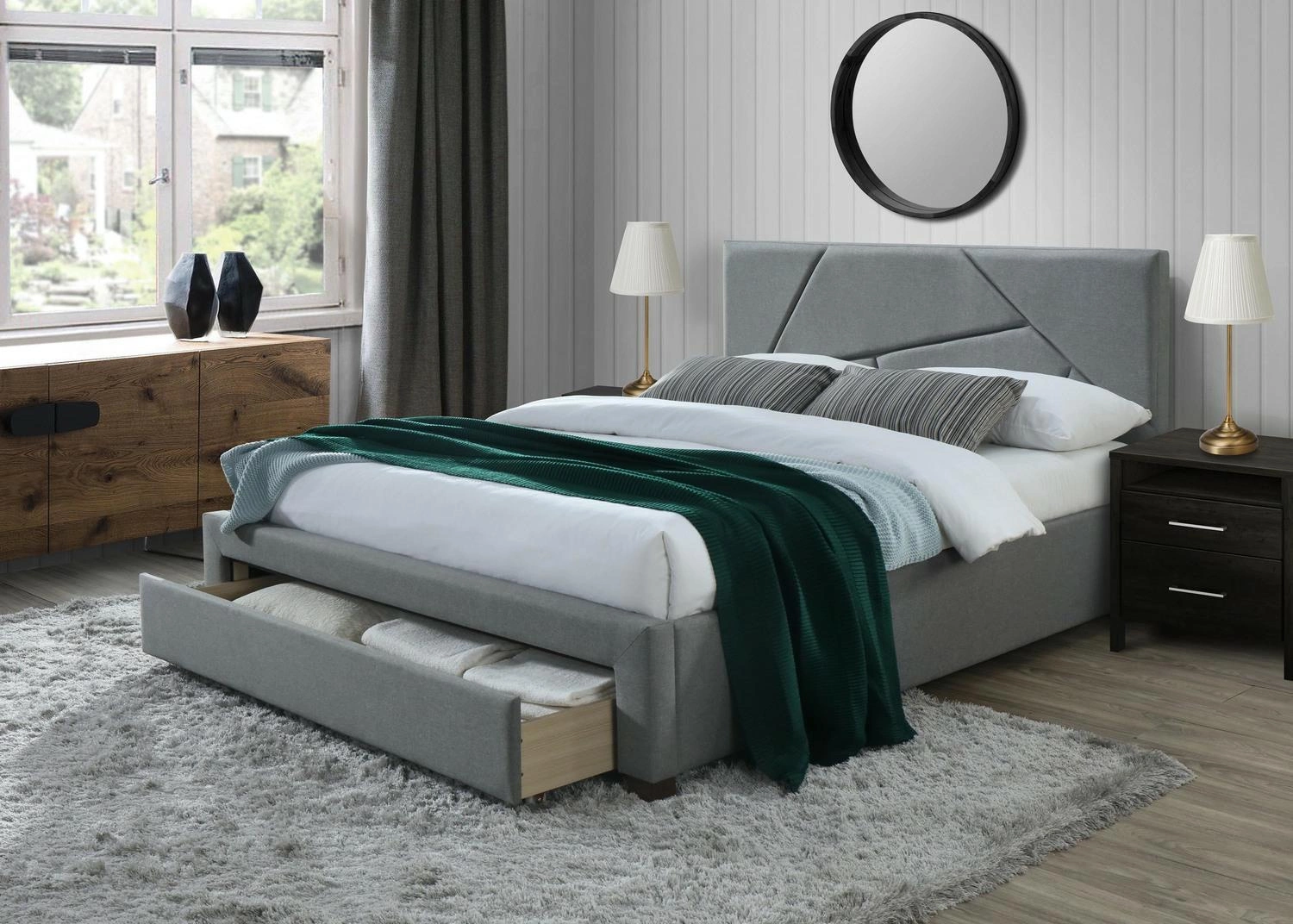 Łóżko Victory 160x200 to nowoczesne łóżko do sypialni, które łączy tapicerowane wykończenie w eleganckiej szarości z solidną ramą z drewna orzechowego. Wyposażone w praktyczną szufladę na pościel oraz wysoki, wygodny zagłówek, zapewnia komfort zarówno podczas snu, jak i wieczornego relaksu. Szerokość 165 cm i długość 214 cm tworzą przestronną powierzchnię spania 160x200 cm, idealną dla par szukających łóżka dwuosobowego w nowoczesnym stylu.