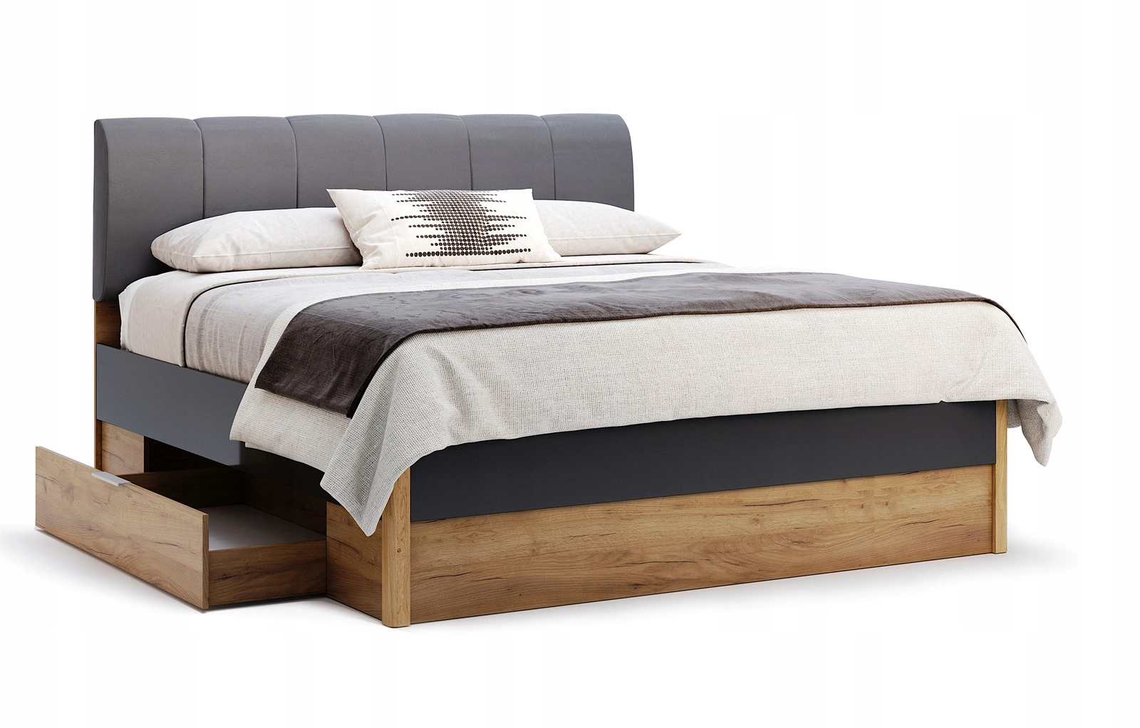 Łóżko Matle 160x200 to nowoczesne łóżko małżeńskie tapicerowane w kolorze szarym z elementami naturalnego dębu, zaprojektowane z myślą o komfortowej sypialni. Model wyróżnia się funkcjonalnym pojemnikiem na pościel w postaci szuflad oraz wysokim, przyjemnym w dotyku zagłówkiem. Powierzchnia spania 160x200 cm zapewnia odpowiednią przestrzeń dla dwóch osób, a praktyczne rozwiązania zwiększają wygodę użytkowania na co dzień.