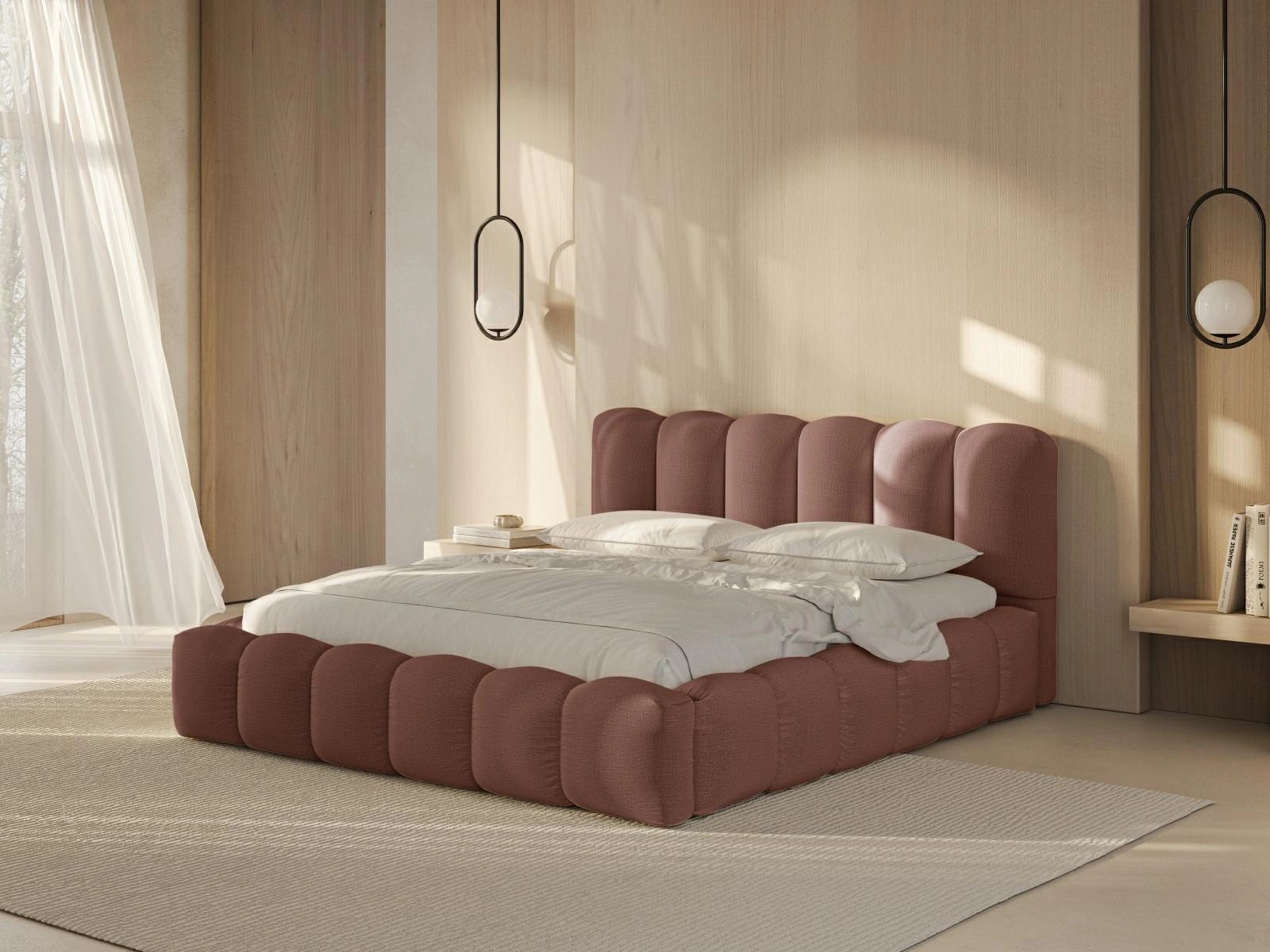 Łóżko Lupine to więcej niż tylko mebel – to centralny punkt aranżacji, który nadaje wnętrzu wyjątkowy charakter. Ciemnoróżowa tapicerka z tkaniny Structured Fabric jest niezwykle przyjemna w dotyku i podkreśla luksusowy, a zarazem nowoczesny styl glamour. Wysokie, miękkie wezgłowie nie tylko zdobi, ale również zapewnia komfort podczas wieczornego czytania czy oglądania filmów.