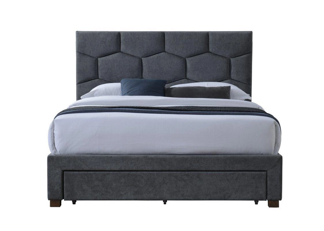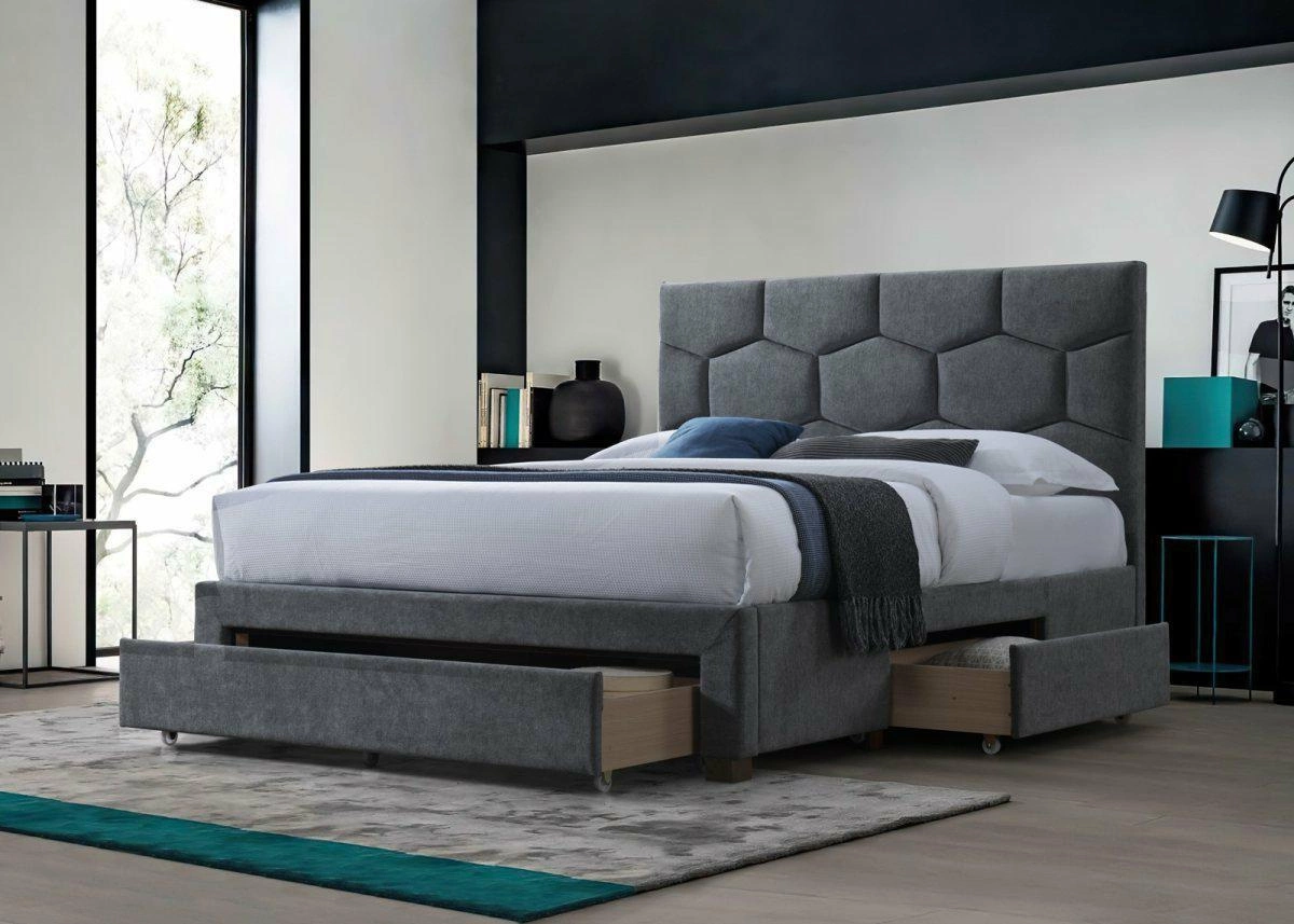 Łóżko tapicerowane Harietta 160x200 to nowoczesne łóżko do sypialni, które łączy w sobie wygodę, funkcjonalność i stylowy wygląd. Model ten wyróżnia się eleganckim, szarym obiciem, pojemnymi szufladami na pościel oraz solidną konstrukcją z drewna. Dzięki dużej powierzchni spania 160x200 cm i wysokiemu zagłówkowi zapewnia komfort zarówno podczas snu, jak i wieczornego relaksu z książką.