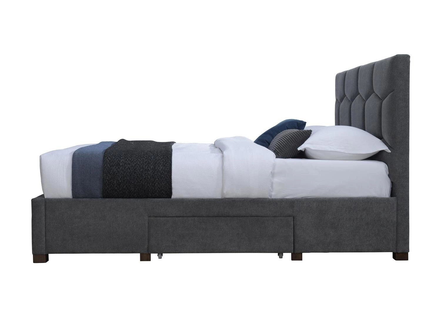 Harietta to łóżko tapicerowane z szufladami, które pozwala sprytnie wykorzystać przestrzeń pod materacem. Dwie pojemne szuflady ułatwiają przechowywanie pościeli, koców czy sezonowej odzieży, pomagając utrzymać porządek w sypialni. Praktyczny pojemnik na pościel sprawia, że nawet w niewielkim wnętrzu znajdziesz miejsce na wszystkie niezbędne rzeczy.