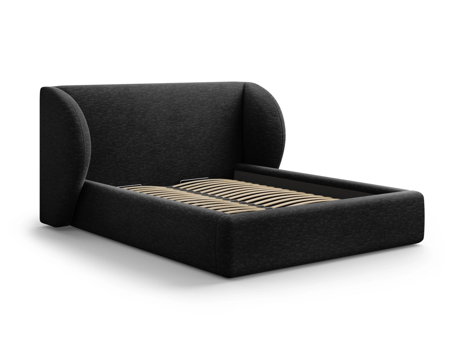 Łóżko Miley II to nowoczesne łóżko tapicerowane 180x200 cm w eleganckim, głębokim odcieniu czerni. Model wyposażony jest w pojemny schowek na pościel oraz solidny stelaż, dzięki czemu idealnie sprawdzi się w sypialni wymagającej zarówno stylu, jak i funkcjonalności. Subtelna tkanina chenille zapewnia wyjątkową miękkość w dotyku, a minimalistyczna forma podkreśla luksusowy charakter wnętrza.