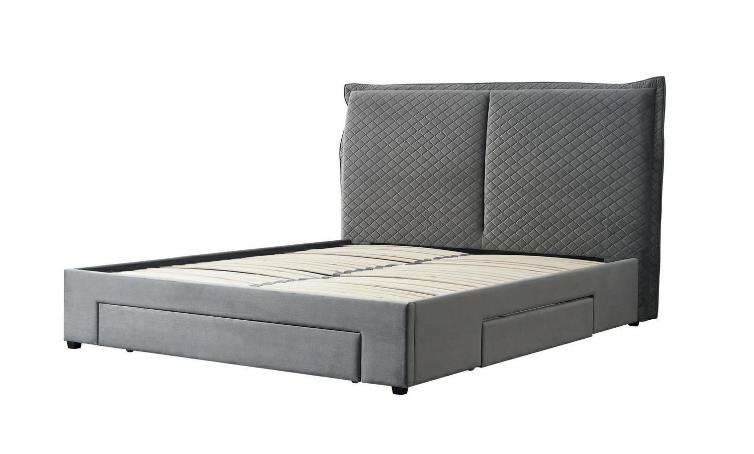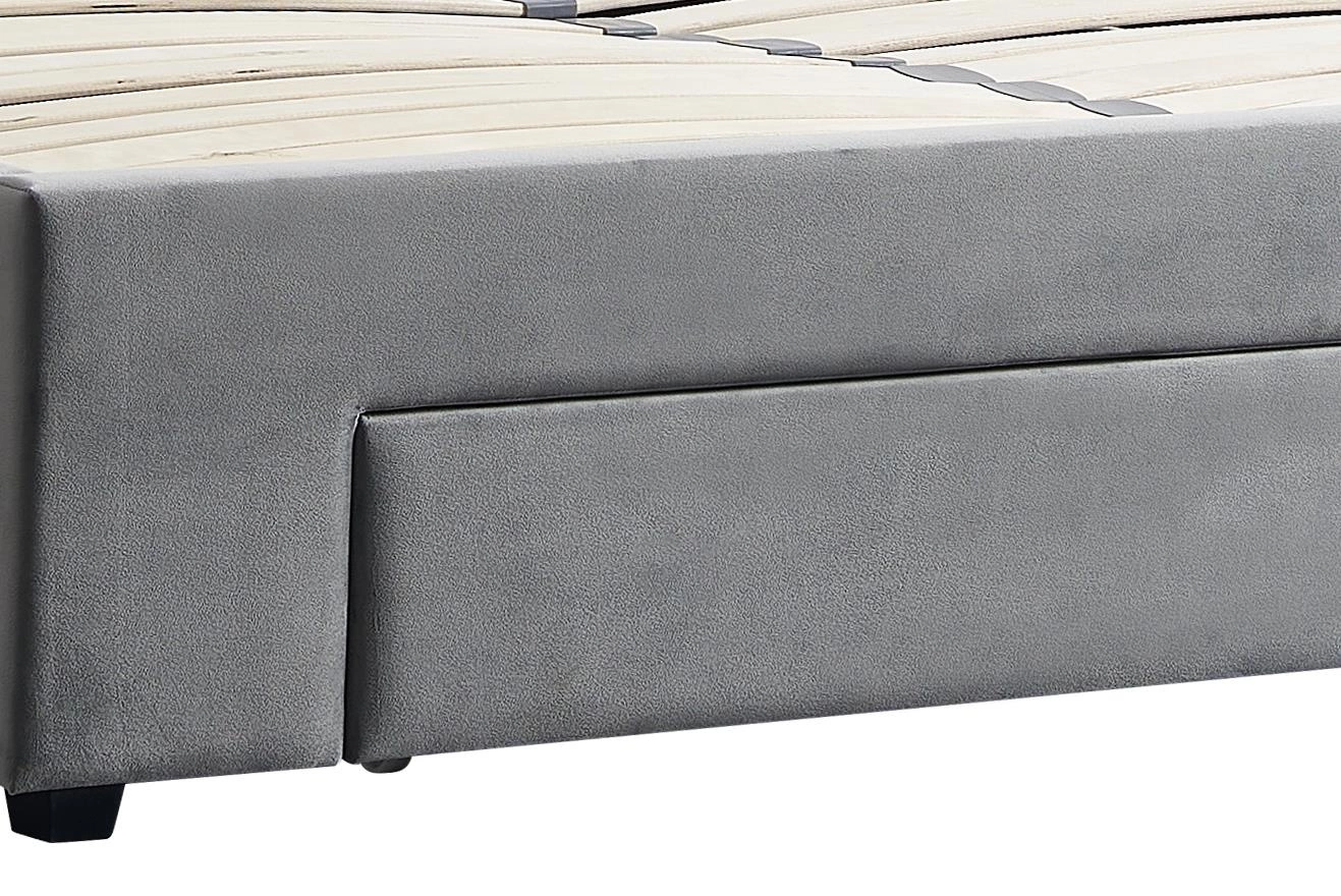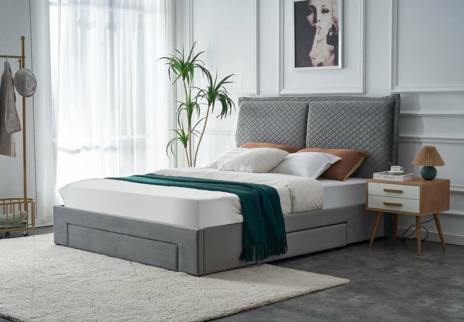 Łóżko tapicerowane Beck 160x200 to połączenie nowoczesnego stylu, szlachetnego weluru w jasnoszarym kolorze oraz praktycznego pojemnika na pościel w formie dwóch szuflad. Szeroka rama (169 cm) i wysokie, pikowane wezgłowie (120 cm) sprawiają, że mebel staje się centralnym punktem każdej sypialni, zapewniając zarówno elegancję, jak i codzienną wygodę. Wytrzymała konstrukcja z elementami drewna gwarantuje stabilność na lata.