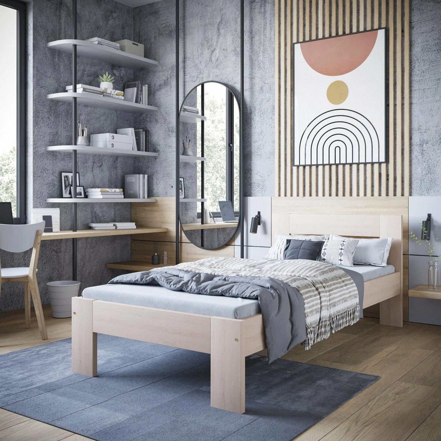 Minimalistyczna forma łóżka Fancy świetnie wpisuje się w nowoczesne i skandynawskie aranżacje. Prostokątny kształt oraz brak zbędnych ozdób sprawiają, że mebel nie przytłacza przestrzeni, a jego lekka konstrukcja na czterech nogach ułatwia utrzymanie porządku w sypialni. Naturalne wybarwienie drewna pięknie podkreśla teksturę materiału, pozwalając na łatwe dopasowanie łóżka do różnych kolorów ścian i dodatków. To doskonała baza dla przytulnej atmosfery w pokoju młodzieżowym lub eleganckiej sypialni dla gości.
