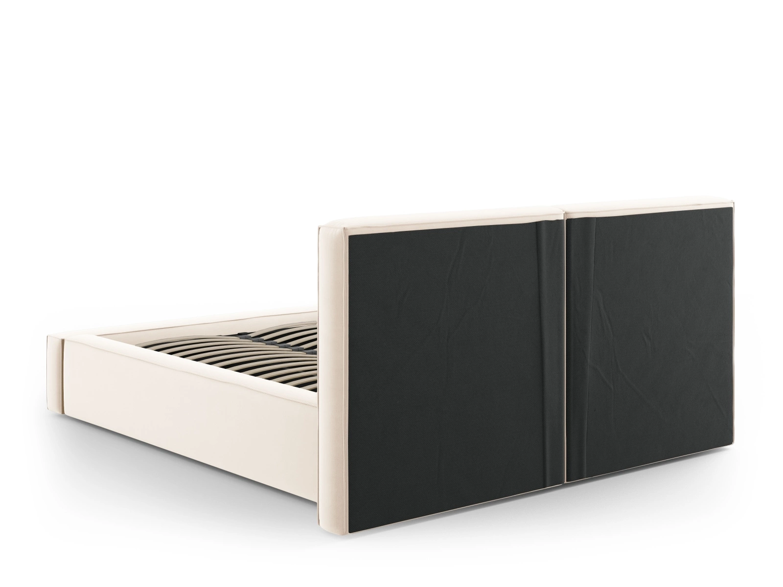 Łóżko Jodie II oferuje nie tylko komfort spania, ale także funkcjonalność dzięki pojemnikowi na pościel. Przestronna skrzynia ukryta pod stelażem pozwala na wygodne przechowywanie kołder, poduszek i sezonowych tekstyliów. Wysokość łóżka (97,5 cm) oraz niskie, subtelne nóżki (2,5 cm) czynią korzystanie z pojemnika łatwym i wygodnym, a zarazem zachowują spójną linię nowoczesnego designu.