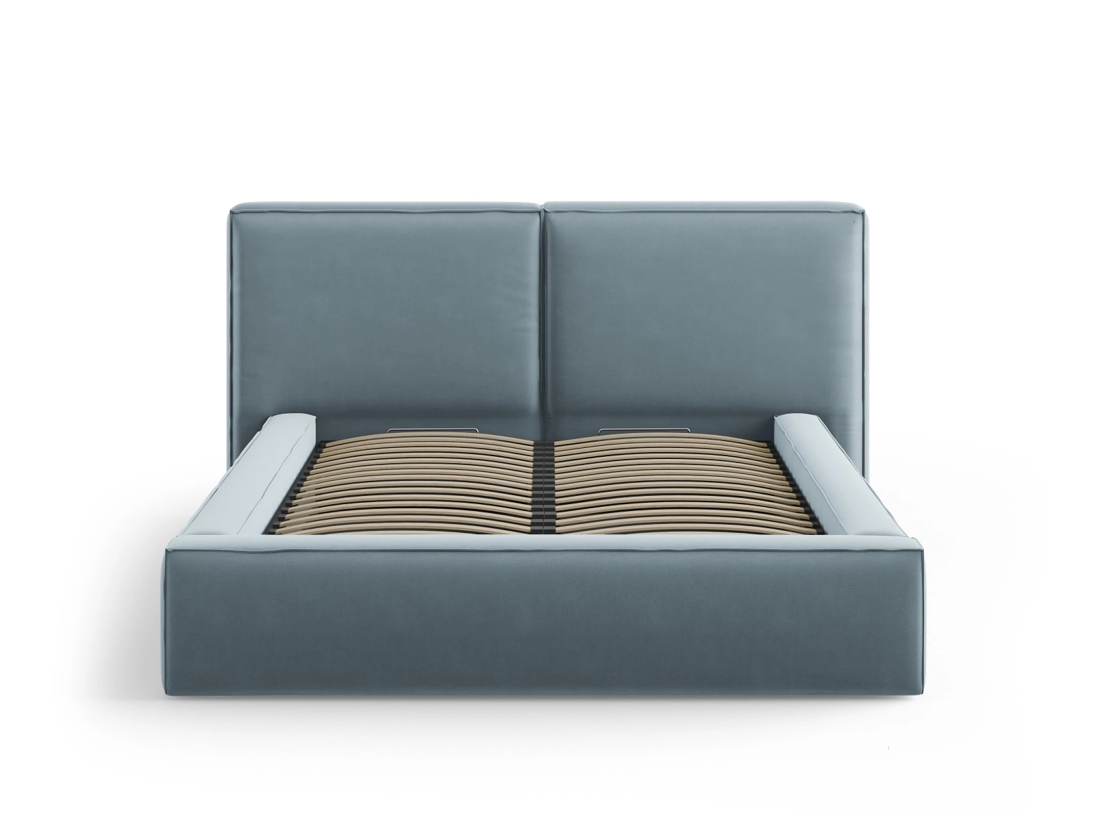Łóżko Jodie II to tapicerowane łóżko do sypialni o powierzchni spania 140x200 cm, wykończone przyjemną w dotyku, welurową tkaniną w jasnym odcieniu niebieskiego. Model wyróżnia się nowoczesnym designem, dużym pojemnikiem na pościel oraz solidnym stelażem w zestawie. Idealnie sprawdzi się jako łóżko dwuosobowe do nowoczesnej sypialni, łącząc komfort codziennego snu z funkcjonalnością i elegancją.
