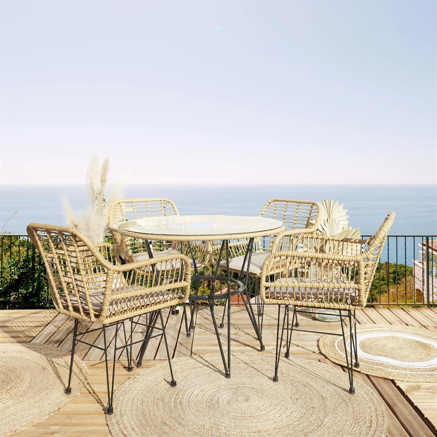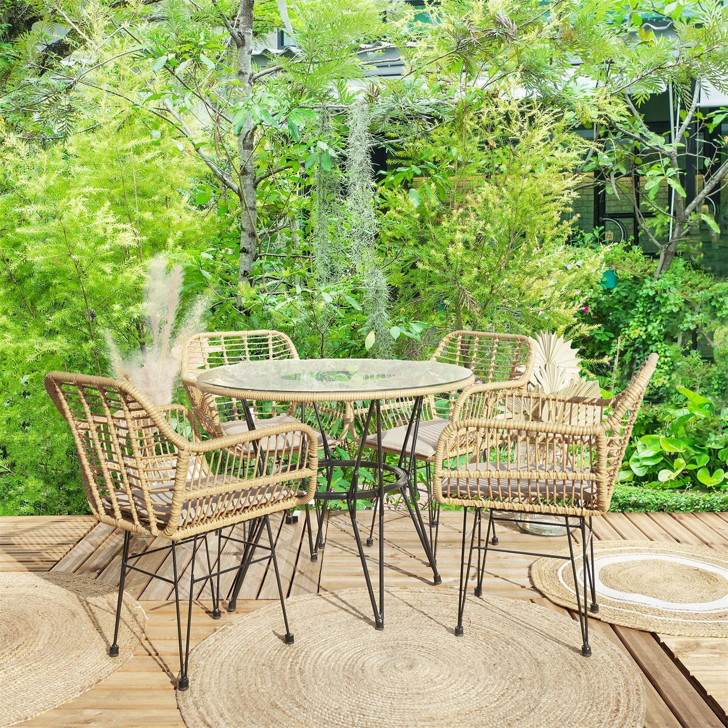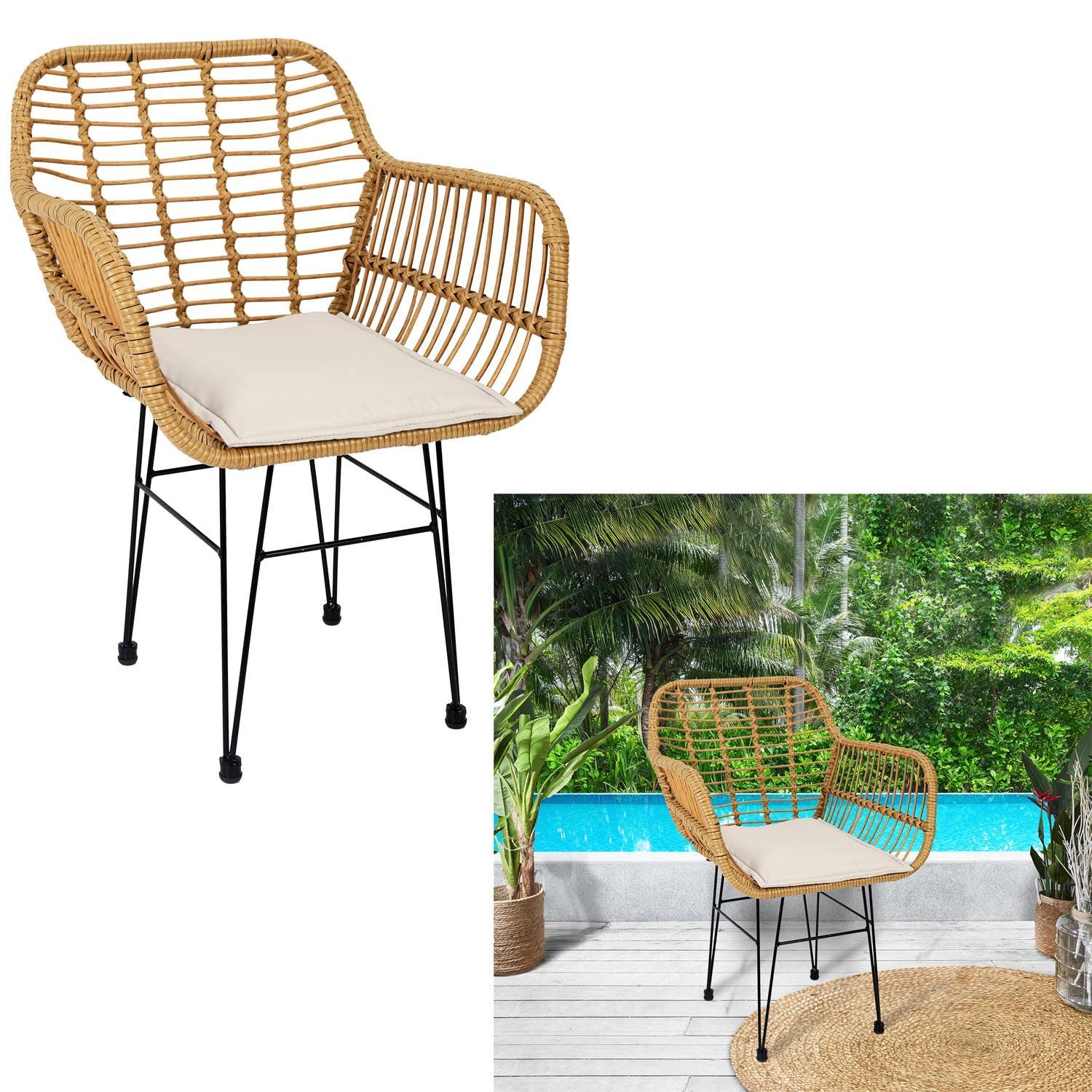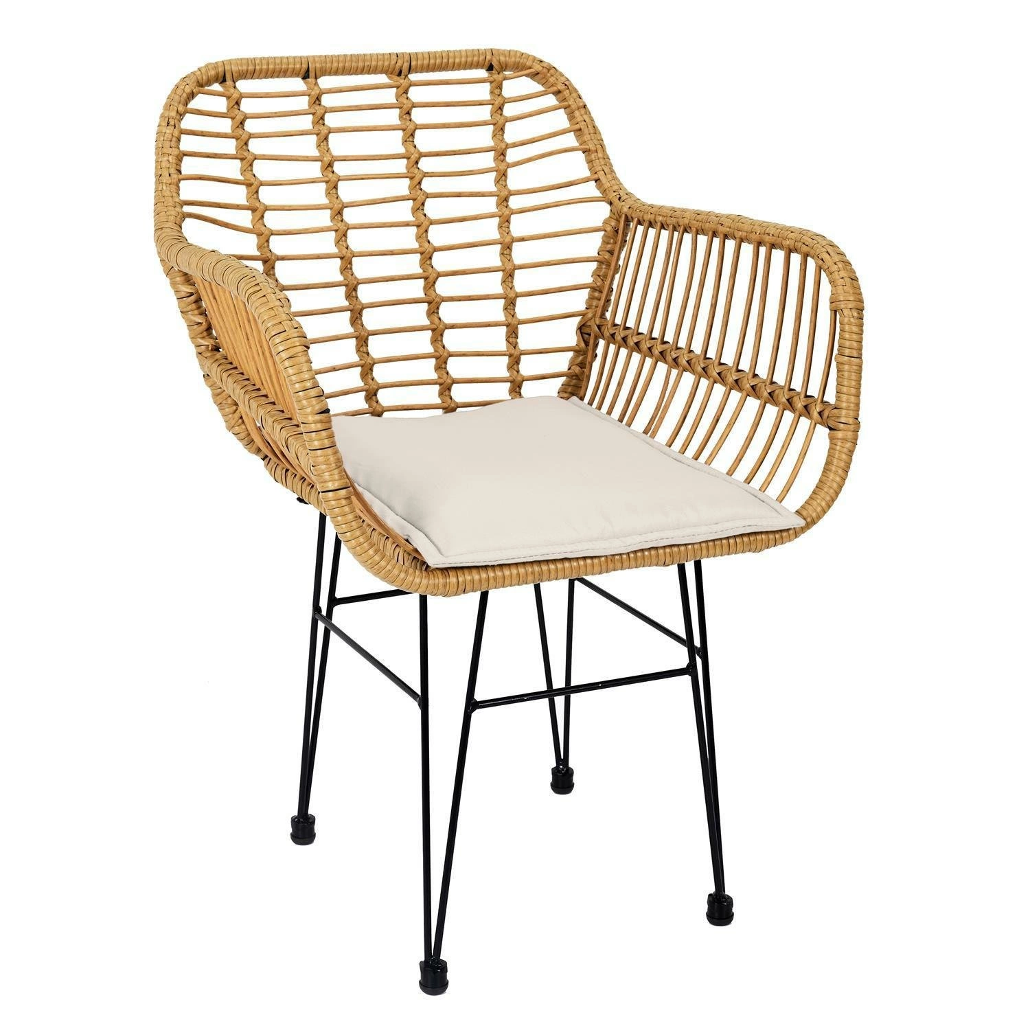 Poczuj się komfortowo z krzesłem Surabaya od Intesi! Ten technorattanowy mebel jest ręcznie tkany w naturalnych kolorach. Stalowa rama jest malowana proszkowo na czarno w celu zwiększenia odporności na warunki atmosferyczne, co sprawia, że to krzesło jest idealne dla każdej przestrzeni na zewnątrz.