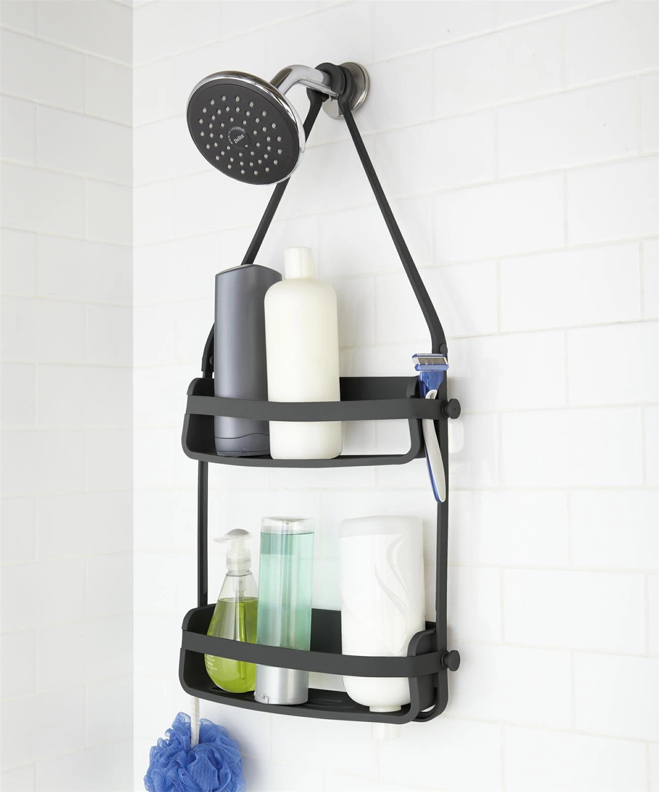 Półka prysznicowa Umbra FLEX została zaprojektowana z myślą o maksymalnej łatwości montażu. Wystarczy ją powiesić na ramieniu prysznica, drążku lub w dowolnym miejscu kabiny – bez konieczności wiercenia ścian. Cztery przyssawki zapewniają stabilność, nawet przy większym obciążeniu, a łatwy demontaż umożliwia szybkie czyszczenie i zmianę miejsca według potrzeb. To rozwiązanie szczególnie docenią osoby wynajmujące mieszkanie lub ceniące elastyczność aranżacji.