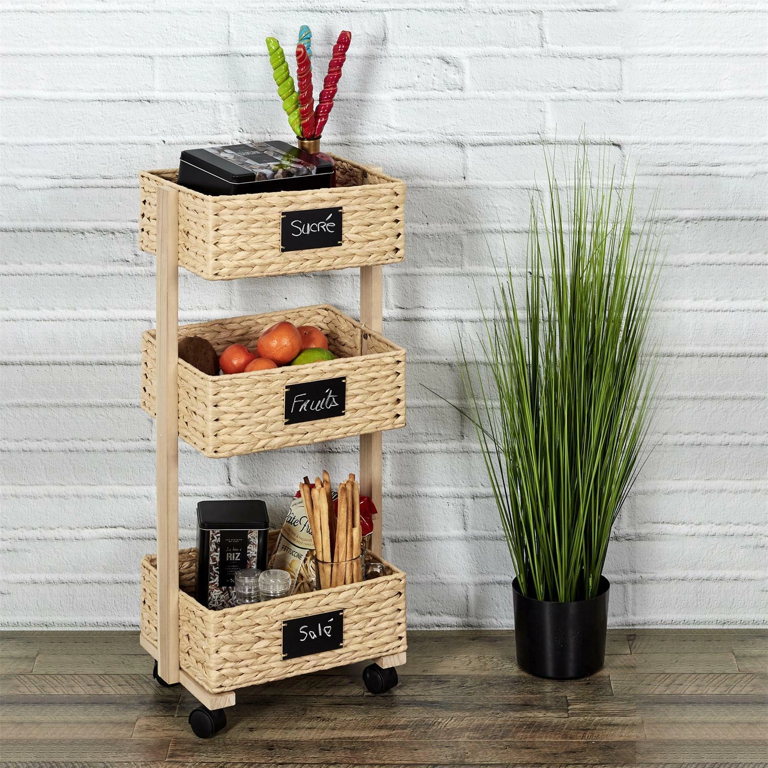 Dzięki temu drewnianemu wózkowi z 4 kołami nie zabraknie Ci już miejsca do przechowywania. Estetyczny i niezwykle praktyczny w przenoszeniu, idealnie wpasuje się w kuchnię, obok biurka czy nawet w sypialni, w której nie możemy sobie pozwolić na marnowanie miejsca. Ciesz się 3 plecionymi koszami do przechowywania z metką i organizuj swoje codzienne życie według własnego rytmu. Półki posiadają kwadraciki, na których kredą możemy podpisać, co w nich jest lub jaką pełnią funkcję. Koszyki plecione są z hiacyntu wodnego i wpiszą się we wnętrza boho nie tylko jako półki na książki lub drobiazgi. Wózek Alzira może być również kwietnikiem dla kwiatów zwisających.