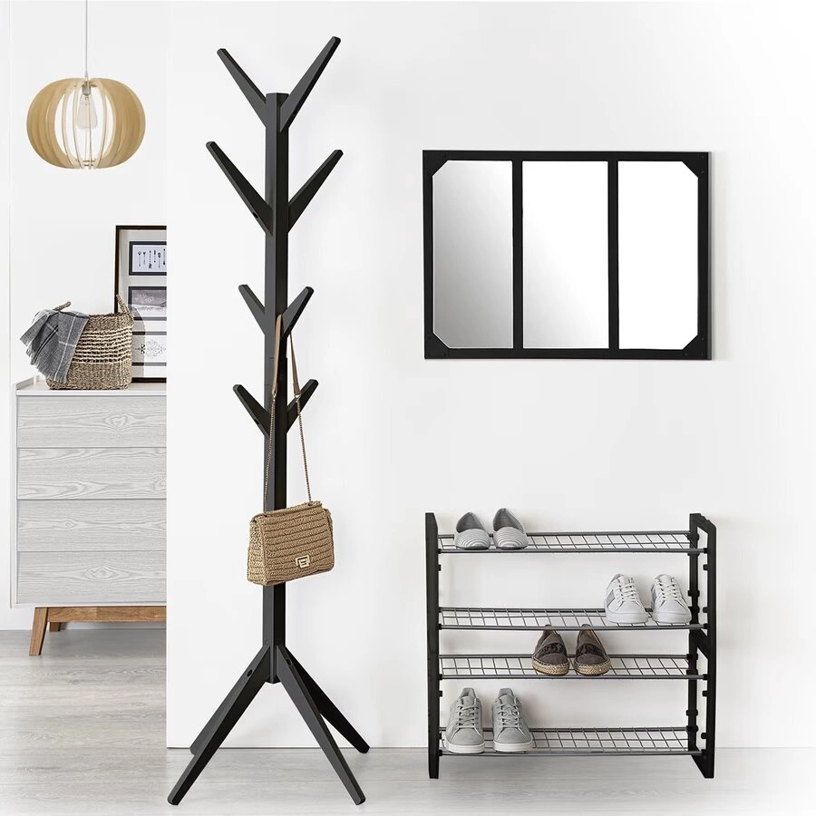 Nowoczesny czarny stojak na buty Staky łączy prostotę z elegancją. Stalowe elementy w odcieniu srebra dodają całości lekkości i podkreślają designerski charakter mebla. Ten regał na buty to nie tylko praktyczny organizer, ale też estetyczny akcent – idealny do wnętrz minimalistycznych, industrialnych i współczesnych. Czarny kolor jest uniwersalny, dlatego stojak łatwo dopasujesz do innych mebli lub dodatków w swoim domu.