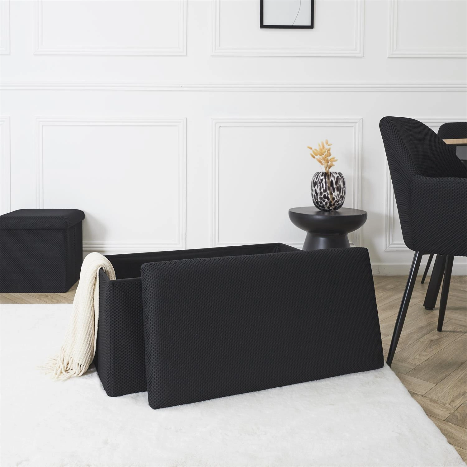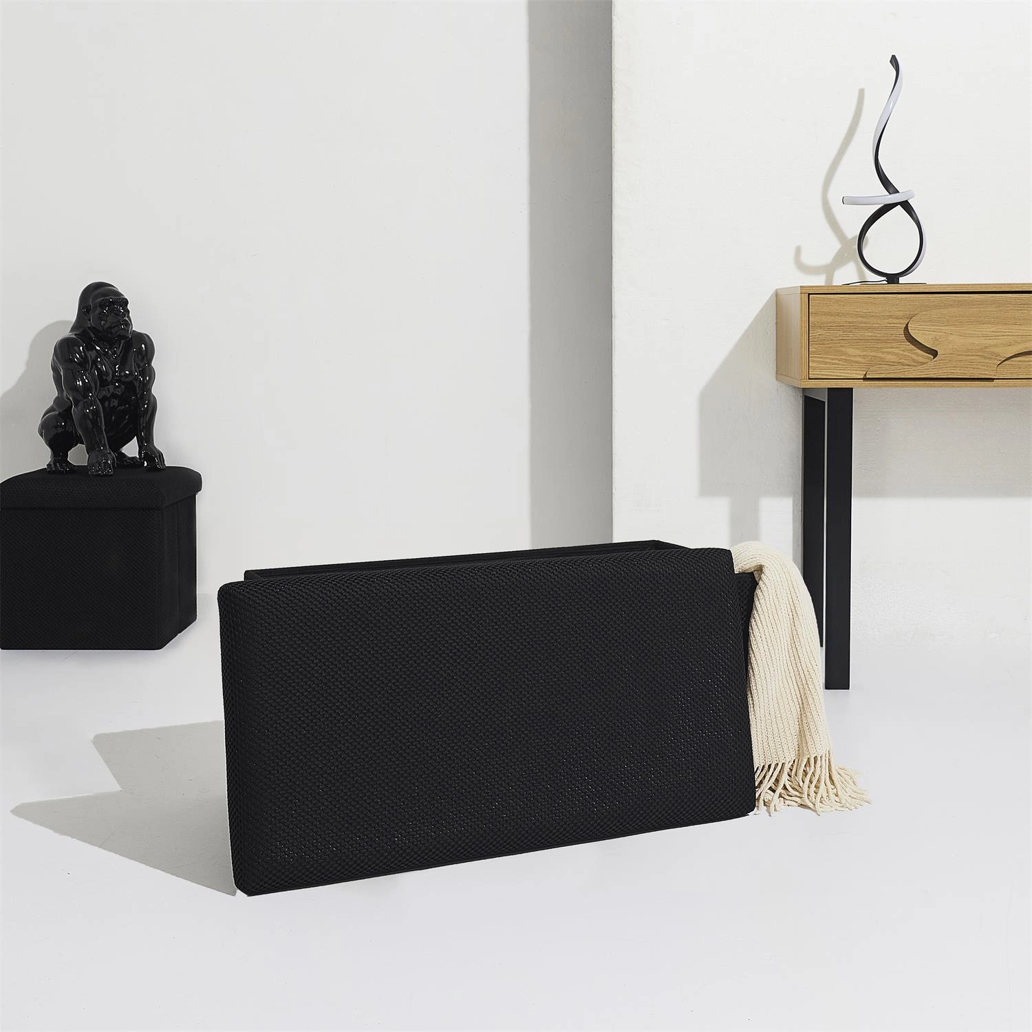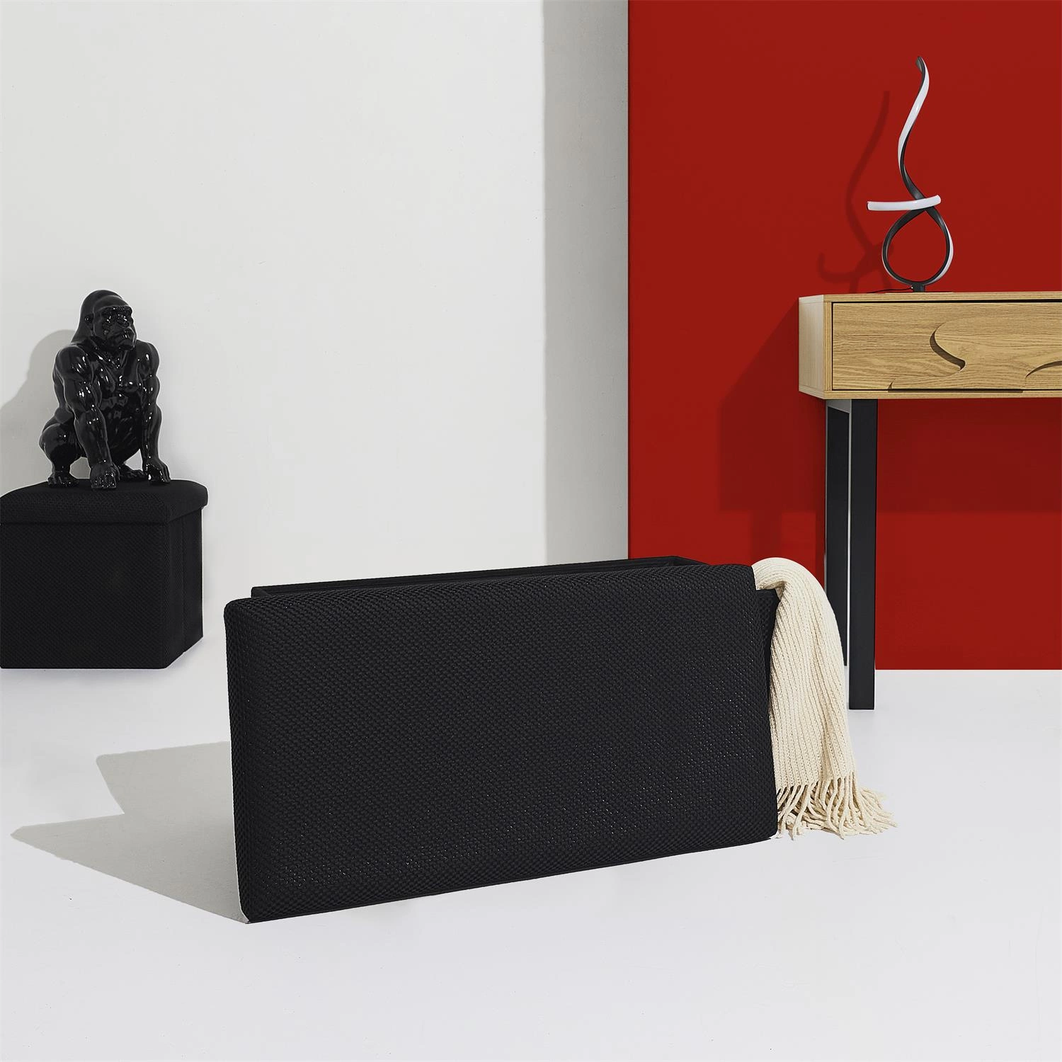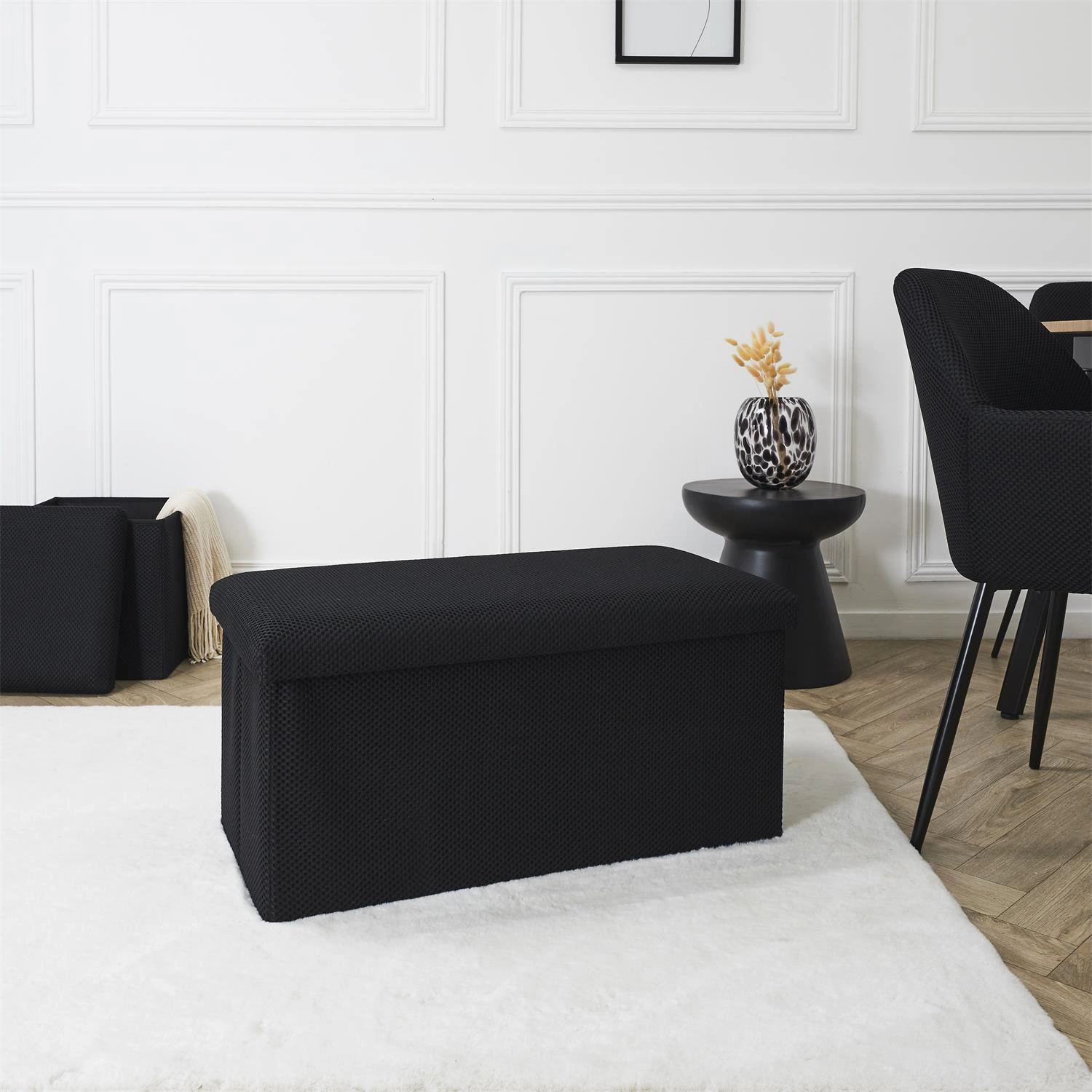 Pufa składana ze schowkiem Velse Atom marki Intesi to nowoczesny, prostokątny mebel tapicerowany w głębokiej czerni. Zaprojektowana z myślą o praktyczności – umożliwia wygodne siedzenie, a w pojemnym schowku bez trudu ukryjesz drobiazgi, buty czy zabawki. Kompaktowe wymiary: szerokość 76 cm, wysokość 38 cm i głębokość 38 cm sprawiają, że pufa doskonale odnajdzie się w przedpokoju, pokoju dziecięcym czy młodzieżowym.