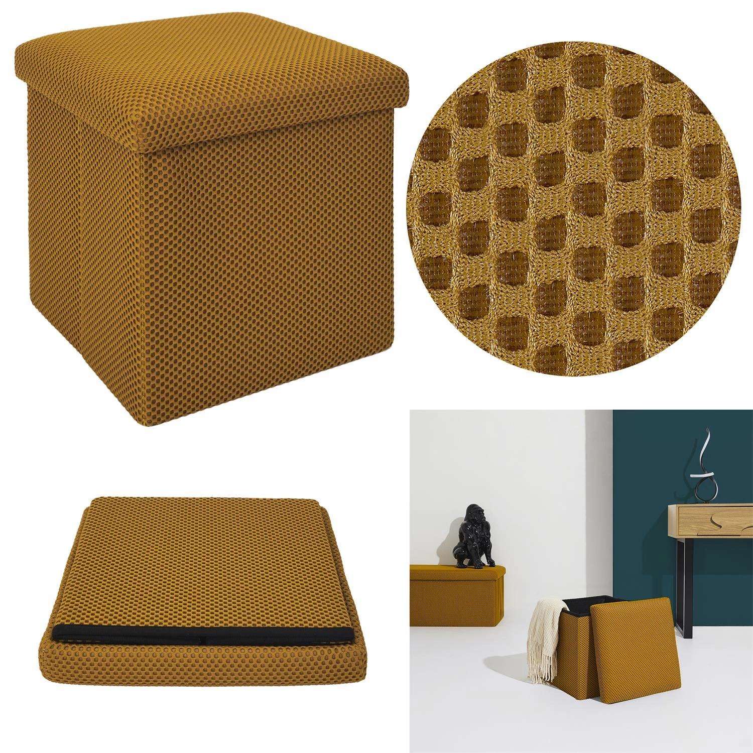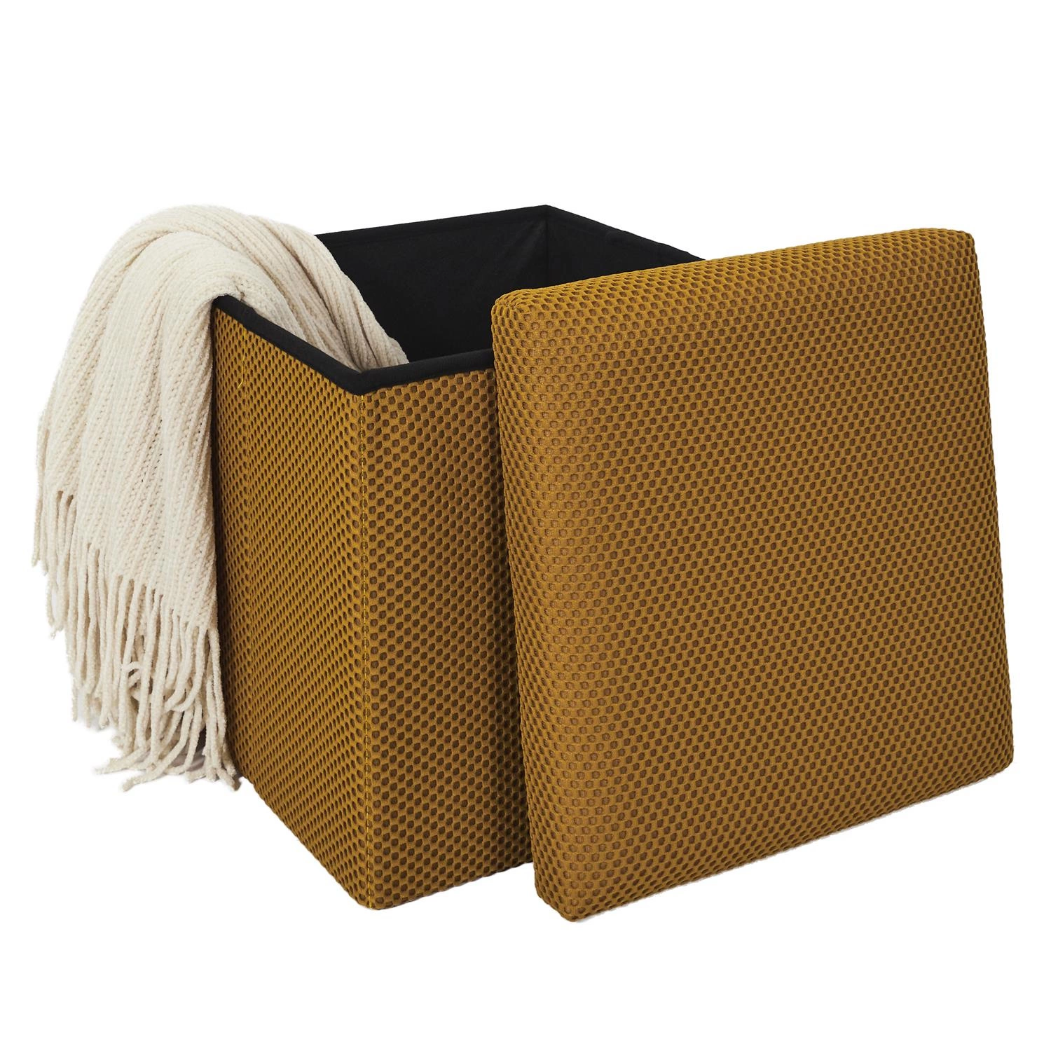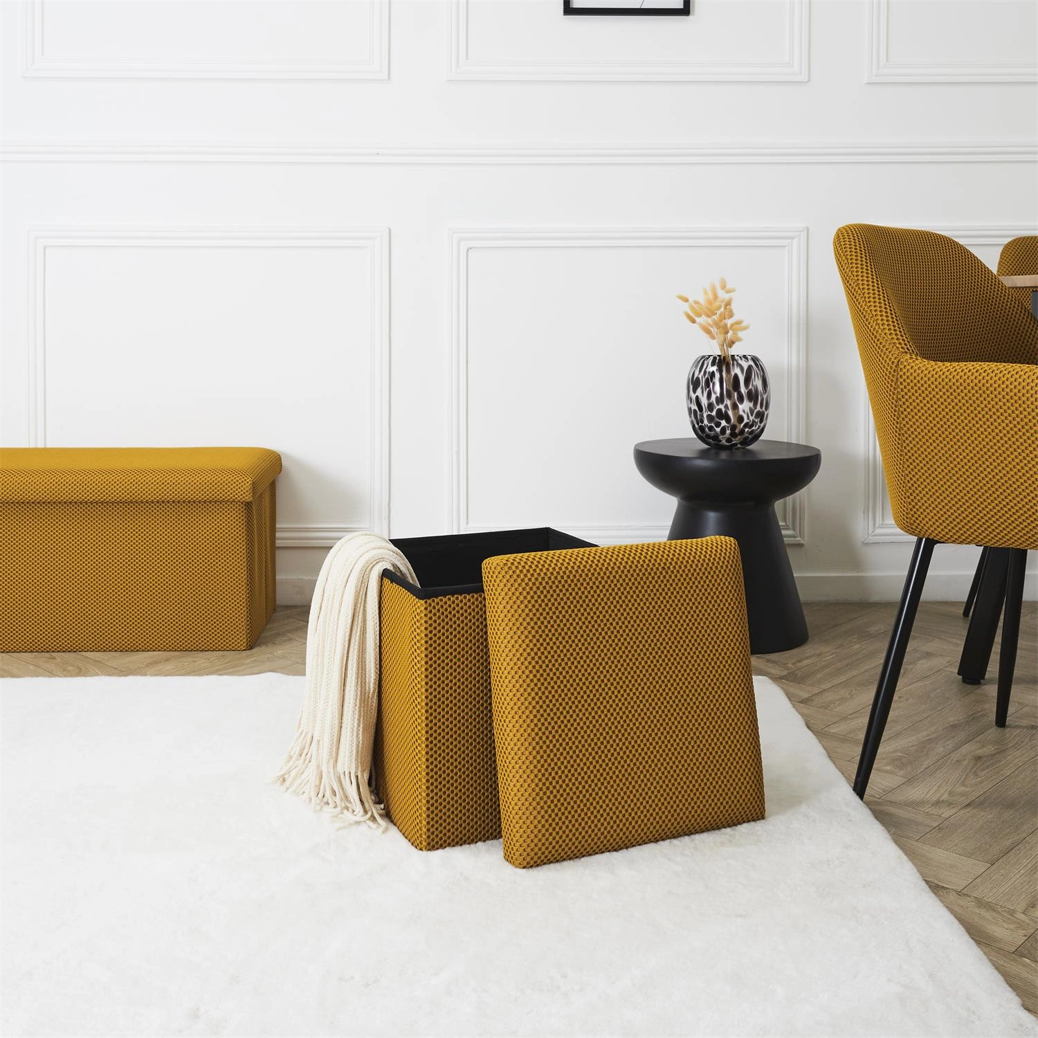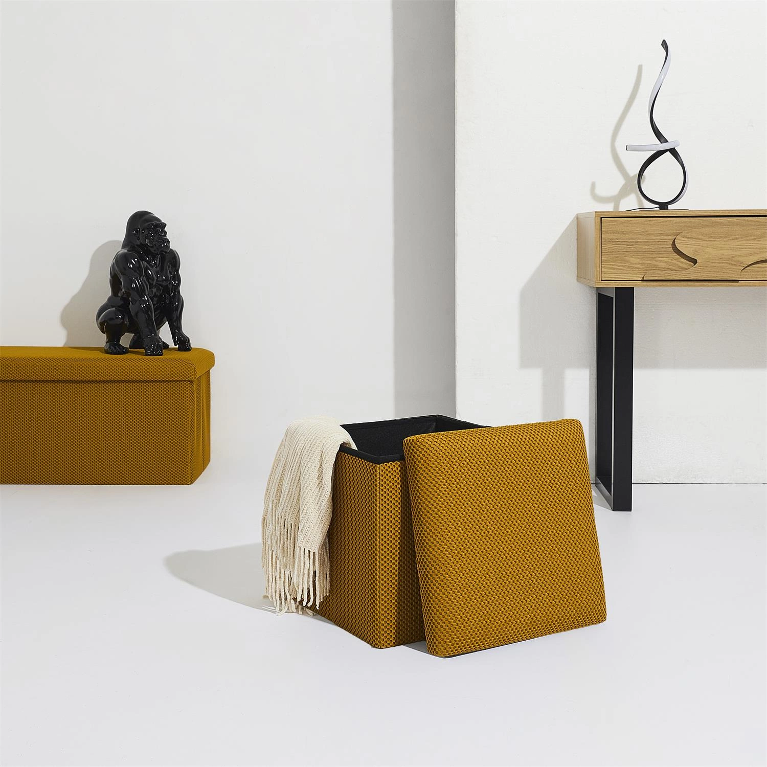 Pufa ze schowkiem Intesi Vels Atom żółta to nowoczesny, kwadratowy mebel tapicerowany, idealny do przedpokoju oraz pokoju dziecięcego. Siedzisko pokryte miękką tkaniną w intensywnym żółtym kolorze przyciąga wzrok i wprowadza do wnętrza energię, a praktyczny schowek ułatwia utrzymanie porządku. Dzięki kompaktowym wymiarom 38×38×38 cm oraz możliwości składania, pufa sprawdzi się zarówno jako wygodne siedzisko, jak i pojemnik na drobiazgi czy zabawki.