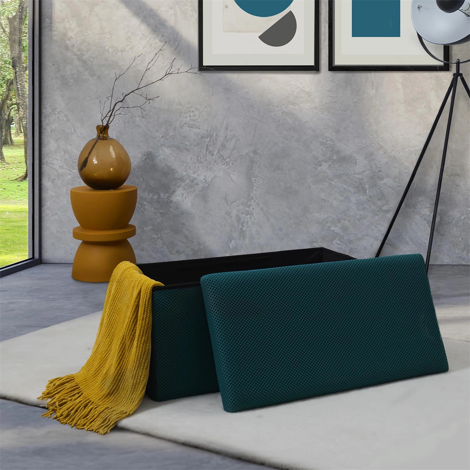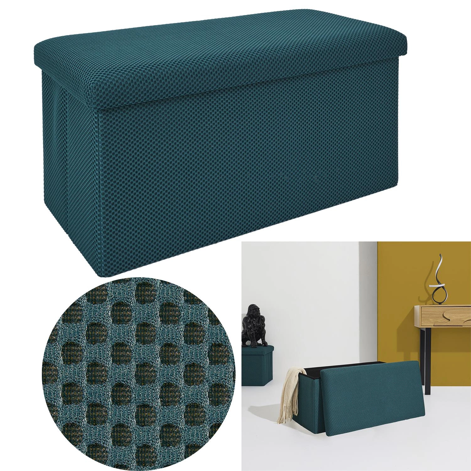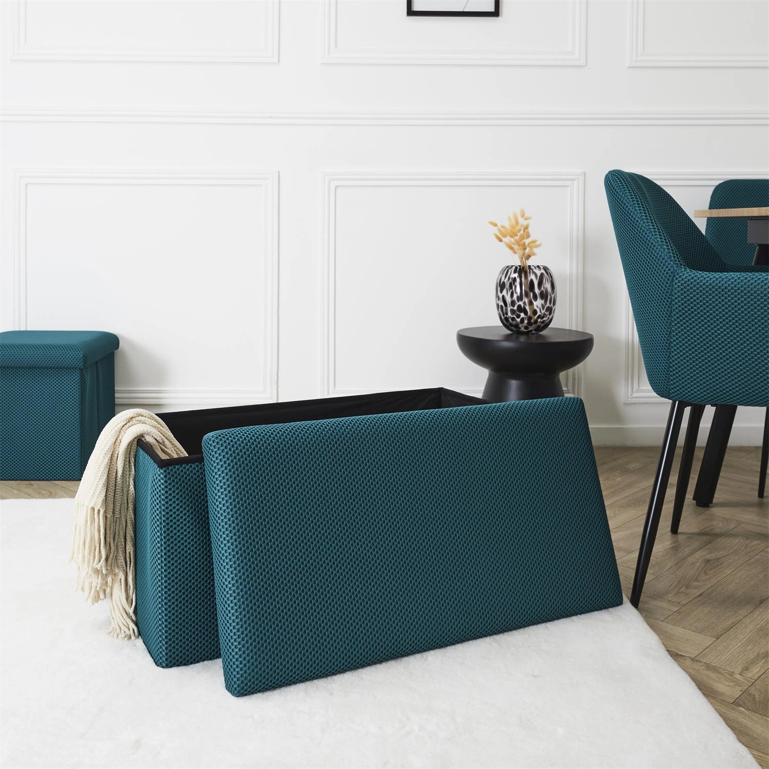 Pufa ze schowkiem Velse Atom marki Intesi to nowoczesny, prostokątny mebel tapicerowany w intensywnie turkusowym kolorze, który doskonale sprawdzi się jako praktyczne siedzisko w przedpokoju, pokoju dziecięcym czy młodzieżowym. Dzięki funkcji składania i pojemnemu schowkowi, pufa łączy wygodę codziennego użytkowania z możliwością przechowywania niezbędnych drobiazgów. Solidna konstrukcja zapewnia maksymalne obciążenie do 80 kg, a miękka tkanina gwarantuje komfort przy każdym usiąściu.