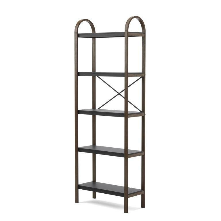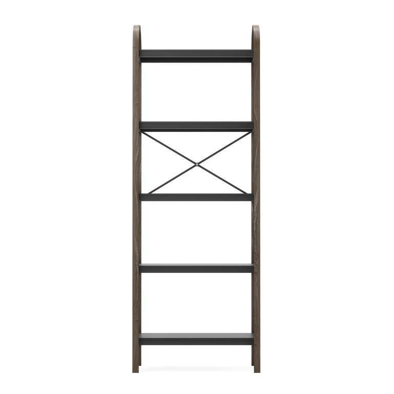 Regał Bellwood posiada pięć szerokich półek z płyt MDF w okleinie oraz szkielet z drewna w kolorze ciemnego orzecha. MDF to wytrzymały materiał, który odporny jest na zniszczenia. Cechą charakterystyczną regału jest zaokrąglona górna część, która całej konstrukcji dodaje wizualnej lekkości. Krzyżujące się wsporniki tworzą ciekawy element dekoracyjny, a przy tym dodatkowo stabilizują mebel. Oprócz świetnego aspektu wizualnego regał to także wiele miejsca do przechowywania. To doskonałe miejsce na ulubione książki, kwiatki czy innego rodzaju dekoracje. Bellwood dostępny także w kolorze białym z naturalnym wykończeniem. Zdecyduj, który lepiej wkomponuje się w twoje wnętrza!