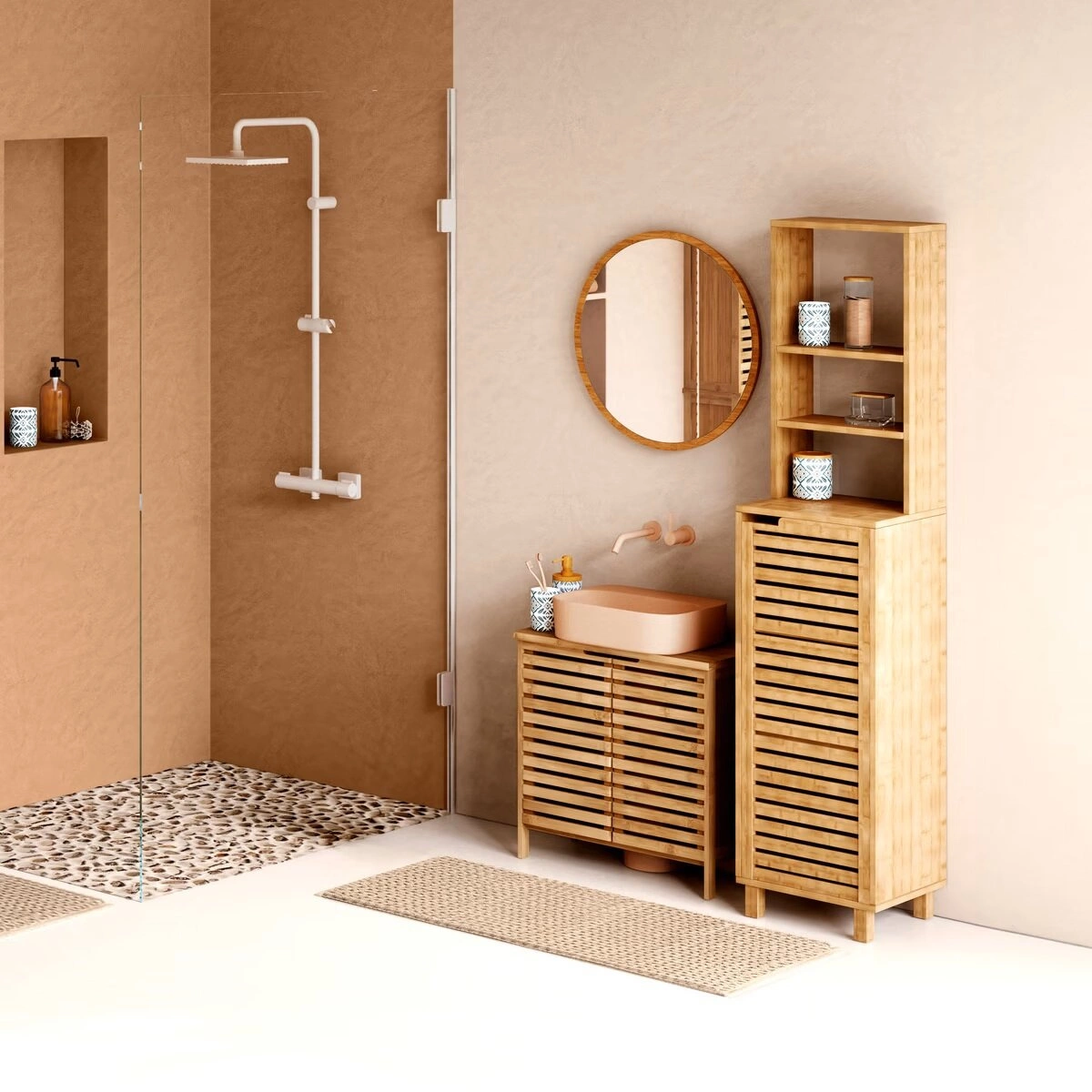 Regał Sicela wykonano w całości z drewna bambusowego z certyfikatem FSC, co gwarantuje nie tylko ekologiczny wybór, ale także dużą odporność na wilgoć i codzienne użytkowanie. Materiał ten nie odkształca się i nie chłonie zapachów, dzięki czemu mebel na długo zachowa swój estetyczny wygląd. Frezowany poziomo front szafki i półmatowe wykończenie podkreślają lekkość oraz naturalność, wzbogacając każde skandynawskie lub boho wnętrze o ciepły, przyjazny akcent.