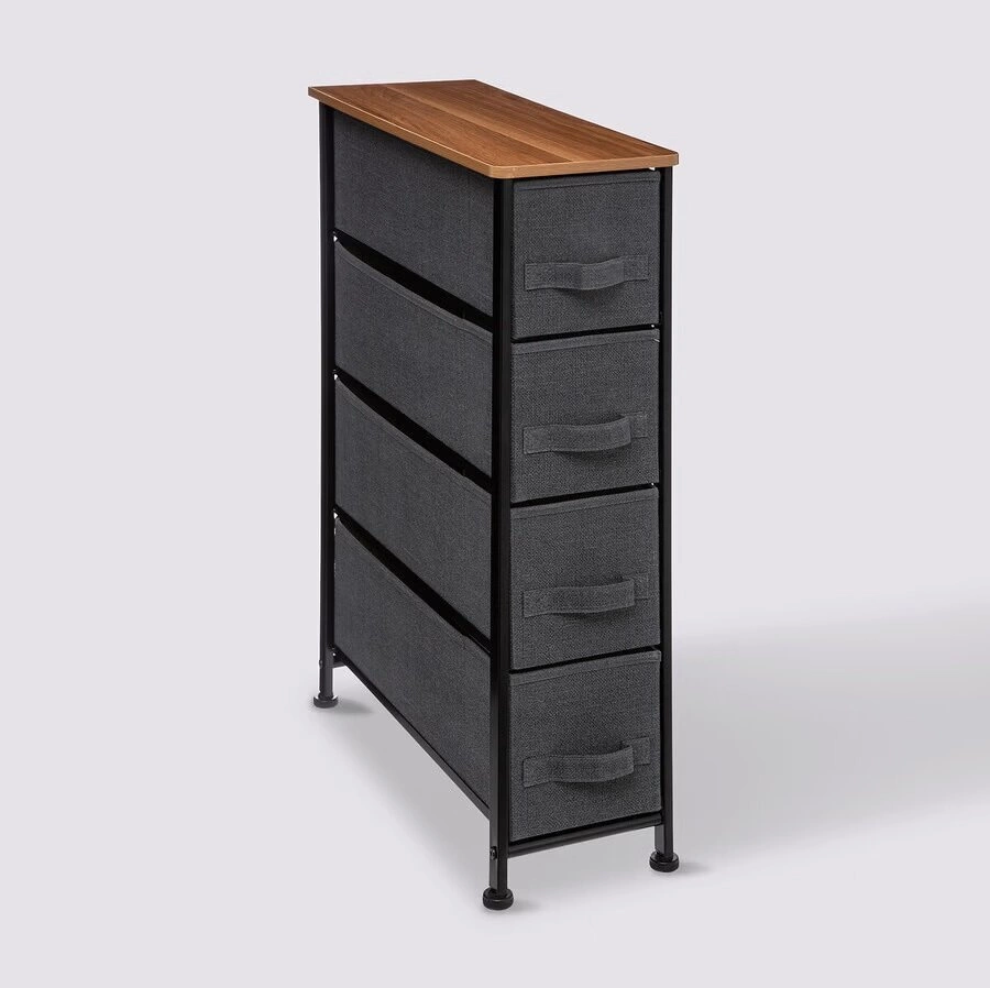Wąski, funkcjonalny regał to doskonałe rozwiązanie do przechowywania drobnych przedmiotów. Posiada cztery wąskie szuflady wykonane z wytrzymałej tkaniny poliestrowej, które pozwalają na uporządkowanie różnorodnych drobiazgów.