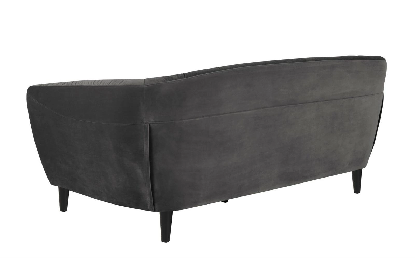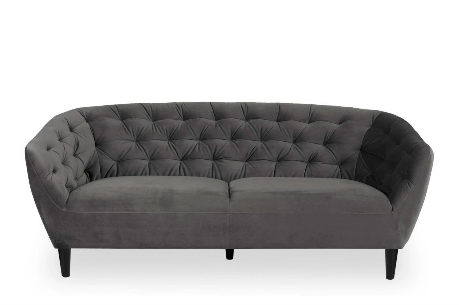 Sofa Ria miękka i wygodna trzyosobowa, ozdobiona eleganckimi, dodającymi gracji pikowaniami, zakończonymi stylowymi guzikami została pokryta tkaniną VIC Dark grey 28 . Ten welwetowy materiał w kolorze ciemnej szarości jest miękki, wdzięczny i przytulny, ma niebagatelny wpływ na poczucie klasy mebla oraz ekskluzywnej formy relaksu i regeneracji przed dalszymi trudami dnia. Sofa Rio zaprojektowana na styl skandynawski znajdzie swoje miejsce zarówno w salonie jak również w pokoju młodzieżowym. Jest meblem nie tylko dobrze zaprojektowanym, ale także starannie wykonanym przy użyciu skrupulatnie dobranych surowców najwyższej jakości. Sofę Rio wsparto na bezpiecznych nogach z twardego drewna kauczukowego zabarwionych na kolor czarny i ochronnie pokrytych lakierem bezbarwnym.