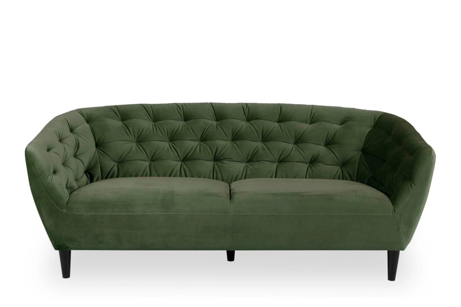 Sofa Ria miękka i wygodna trzy osobowa, ozdobiona eleganckimi, dodającymi gracji pikowaniami, zakończonymi stylowymi guzikami została pokryta tkaniną VIC Forest green 68AC. Ten welwetowy materiał w kolorze ciemnej zieleni jest miękki, wdzięczny i przytulny, ma niebagatelny wpływ na poczucie klasy mebla oraz ekskluzywnej formy relaksu i regeneracji przed dalszymi trudami dnia. Sofa Rio zaprojektowana na styl skandynawski znajdzie swoje miejsce zarówno w salonie jak również w pokoju młodzieżowym. Jest meblem nie tylko dobrze zaprojektowanym, ale także starannie wykonanym przy użyciu skrupulatnie dobranych surowców najwyższej jakości. Sofę Rio wsparto na bezpiecznych nogach z twardego drewna kauczukowego zabarwionych na kolor czarny i ochronnie pokrytych lakierem bezbarwnym.