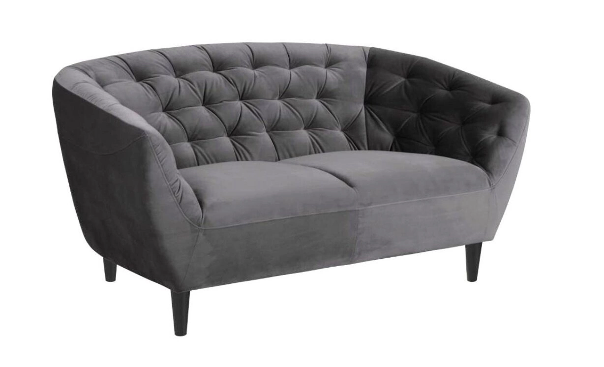 Sofa 2-ososbowa Ria to wyjątkowy, elegancki mebel do salonu, hotelowego holu bądź kawiarnianej przestrzeni. Siedzisko tapicerowane welurową tkaniną VIC w kolorze szarym posiada pikowanie na oparciu, które dodaje elegancji i klasy. Nóżki wykonane zostały z solidnego kauczukowego drewna, malowanego na kolor czarny. Prosta forma oraz miękkie kształty sprawiają, że sofa Ria odnajdzie się w każdym wnętrzu.