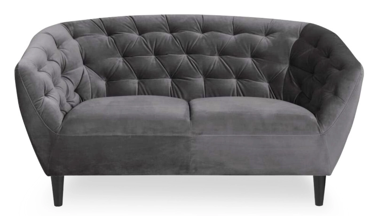 Sofa 2-ososbowa Ria to wyjątkowy, elegancki mebel do salonu, hotelowego holu bądź kawiarnianej przestrzeni. Siedzisko tapicerowane welurową tkaniną VIC w kolorze szarym posiada pikowanie na oparciu, które dodaje elegancji i klasy. Nóżki wykonane zostały z solidnego kauczukowego drewna, malowanego na kolor czarny. Prosta forma oraz miękkie kształty sprawiają, że sofa Ria odnajdzie się w każdym wnętrzu.