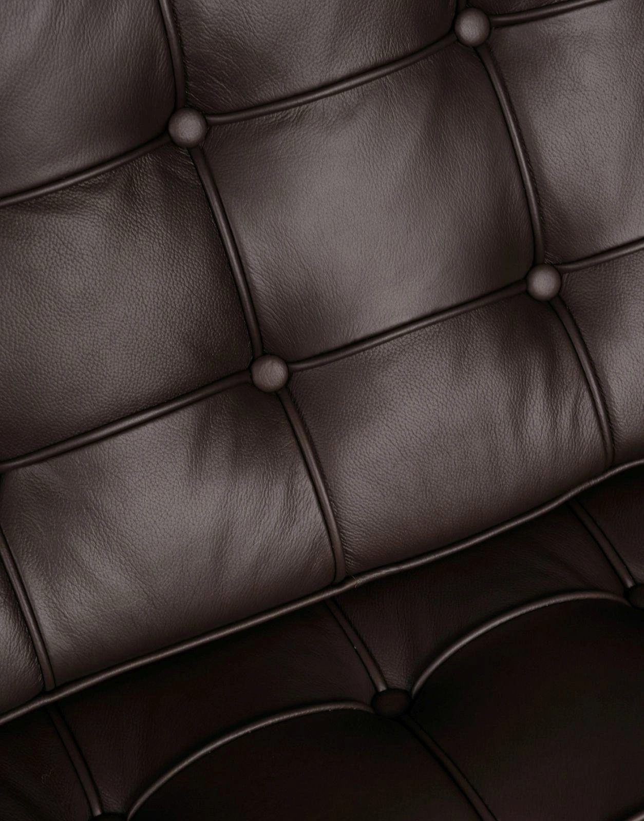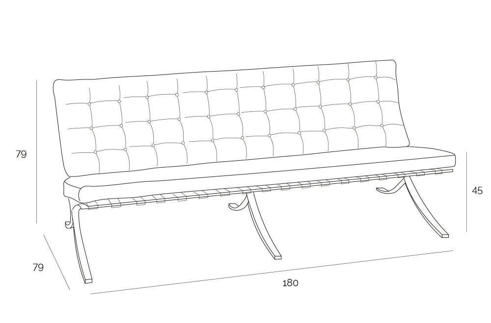 Jest to zaprojektowana w 1929 roku sofa, która powstał na zamówienie, i stanęła w niemieckim pawilonie na wystawie w Barcelonie.,Charakterystycznie powyginana w kształt litery "X" chromowana podstawa oraz pikowana w kwadraty skóra naturalna to najbardziej charakterystyczne cechy tego produktu. Cała kolekcja Barcelona to fotel z podnóżkiem, sofy, ławki, leżanka i stolik.,Sofa wykonana jest ze skóry naturalnej.,Prezentowany produkt jest inspirowany projektem Barcelona.,