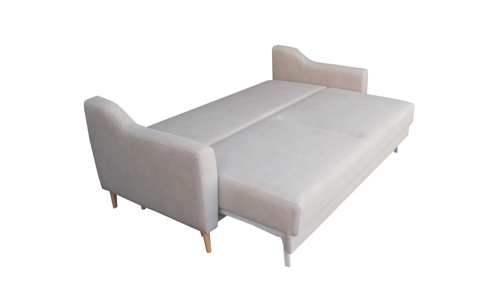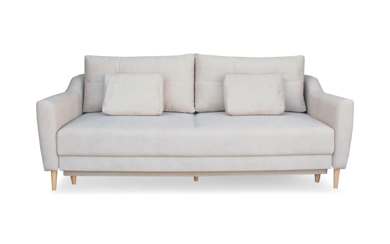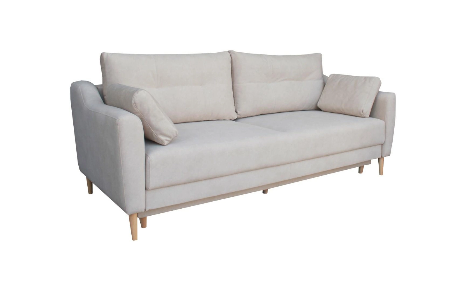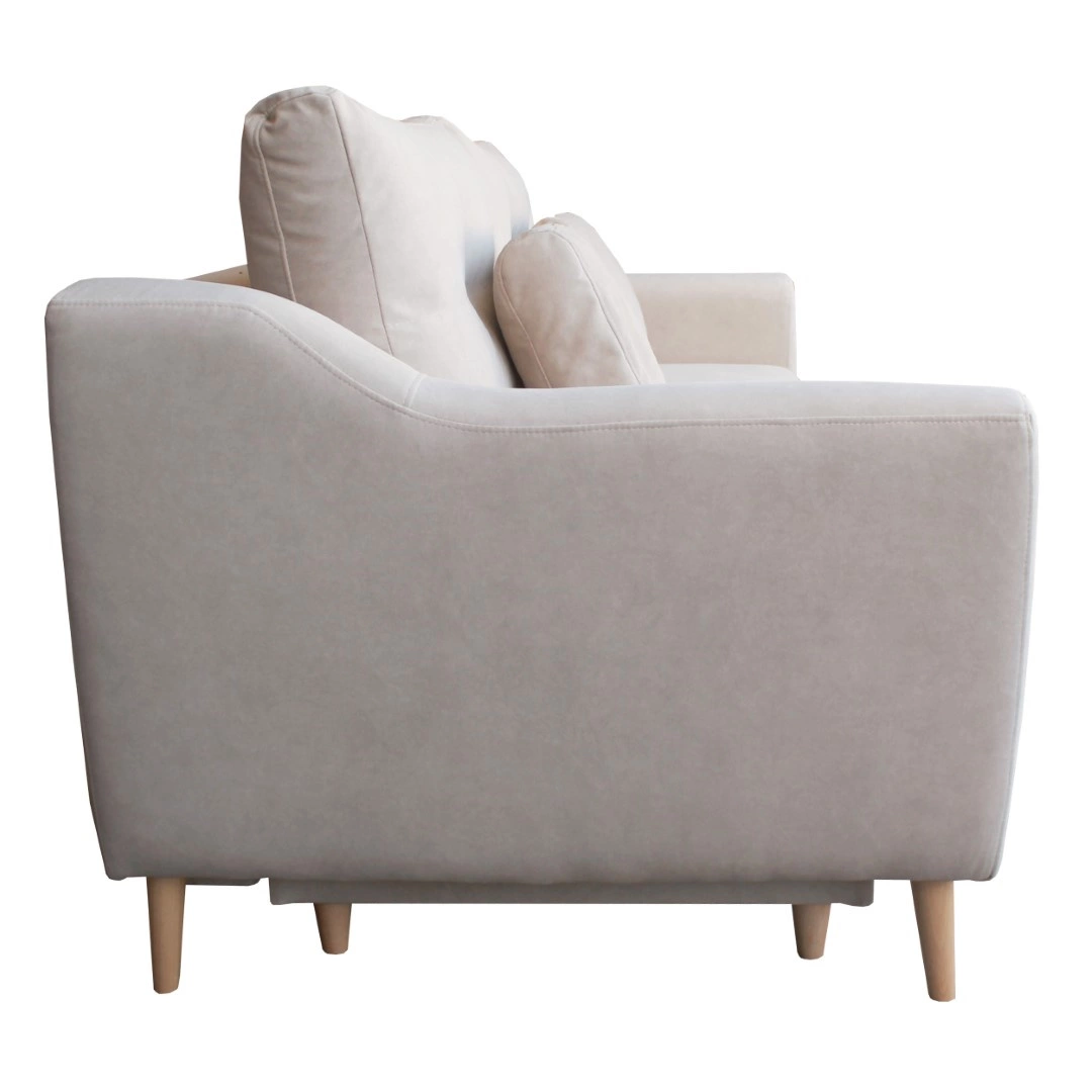 Sofa rozkładana Bouley marki Intesi to 3-osobowy mebel, który łączy skandynawski design z praktycznymi funkcjami – rozkładaniem do spania i pojemnikiem na pościel. Jej szerokość 211 cm sprawia, że doskonale sprawdza się zarówno jako wygodna kanapa do codziennego relaksu, jak i pełnowymiarowe łóżko o powierzchni 190×142 cm. Delikatny, beżowy odcień tkaniny Cloud oraz naturalne drewniane nóżki podkreślają lekkość i harmonię skandynawskiego stylu, wprowadzając do salonu atmosferę przytulności.