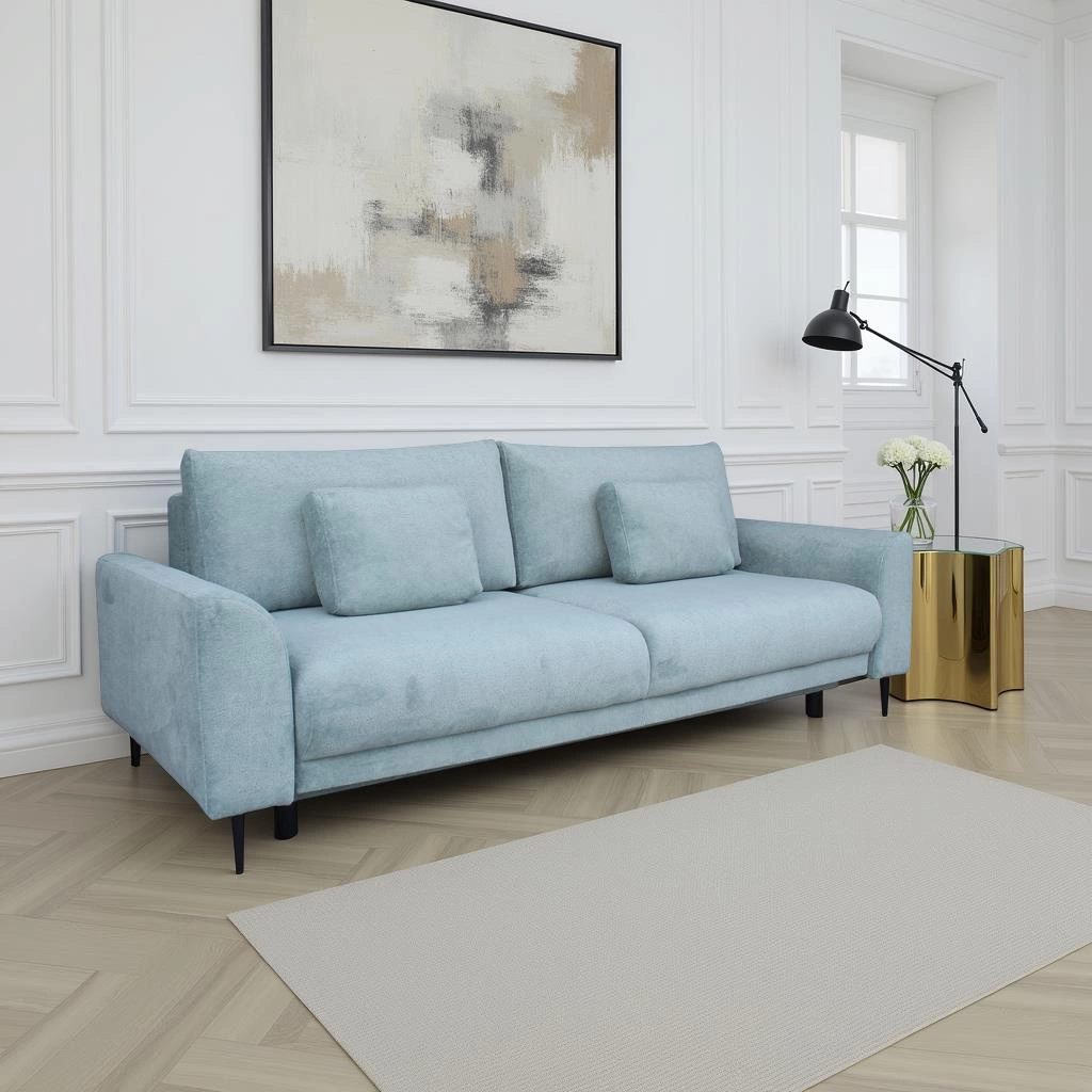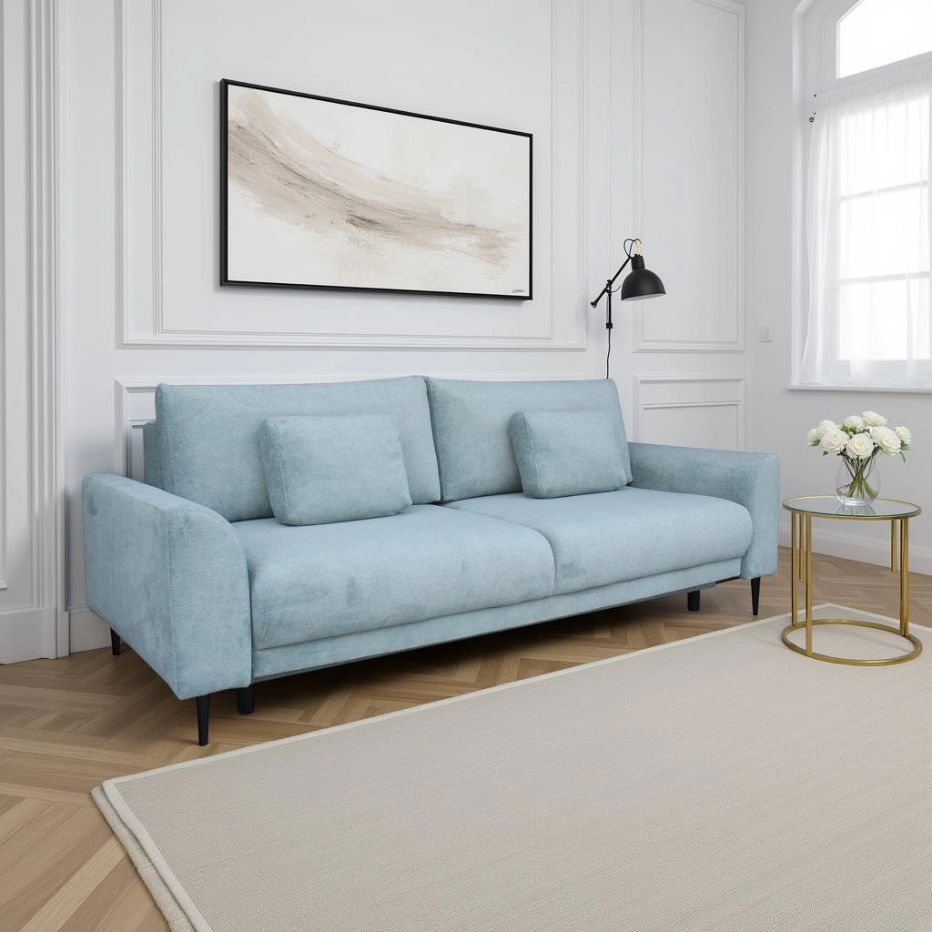 Sofa rozkładana Ferrero marki Intesi to nowoczesna sofa 3 osobowa w stylu skandynawskim, tapicerowana przyjemną w dotyku tkaniną Bellini w odcieniu niebieskim. Wyposażona w funkcję spania oraz praktyczne podłokietniki, idealnie sprawdza się w salonie jako komfortowe miejsce do codziennego wypoczynku i okazjonalnego spania. Z szerokością 235 cm i powierzchnią spania 193x152 cm, Ferrero zapewnia wygodę zarówno podczas spotkań z bliskimi, jak i nocnego odpoczynku dla gości.