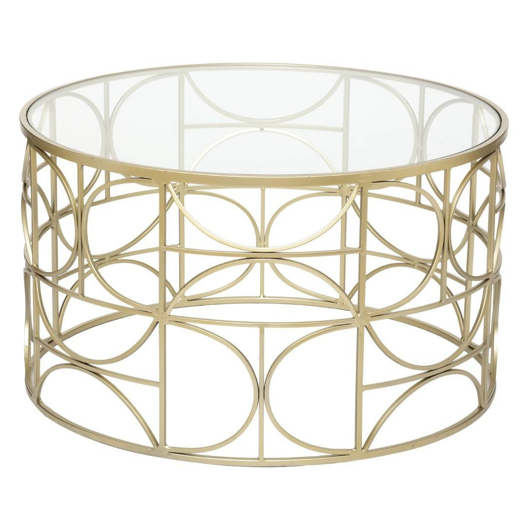 Okrągły stolik kawowy na złotej podstawie ze szklanym blatem w stylu glamor będzie idealnym meblem, na który odstawimy popołudniową kawę lub książkę. Stolik Artif wykonany został z hartowanego szkła, oraz metalowej podstawy w kolorze złotym. Ażurowa, delikatna podstawa stolika dodaje całej konstrukcji lekkości.