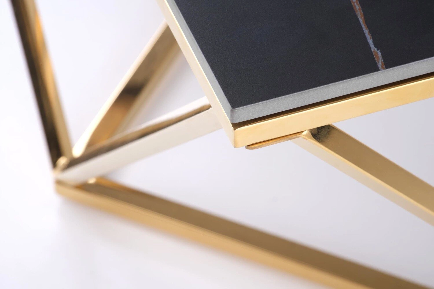 Wykonanie z materiałów wysokiej jakości, takich jak spiek i stal nierdzewna, zapewnia nie tylko estetykę, ale również trwałość. Spiek na blacie jest odporny na zarysowania, wysokie temperatury i wilgoć, co czyni stolik idealnym do codziennego użytku, a jednocześnie łatwym w utrzymaniu czystości. Stal nierdzewna w złotym kolorze nie tylko wzmacnia konstrukcję, ale także dodaje całości luksusowego charakteru, idealnie współgrając z marmurowym blatem.