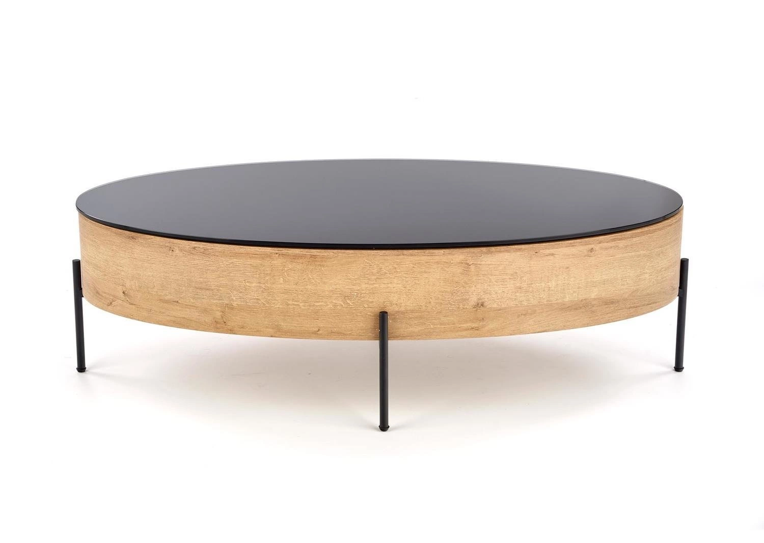 Stolik kawowy to także nie tylko stylowe, ale i funkcjonalne rozwiązanie. Posiada pojemnik na drobiazgi, dzięki czemu zawsze będziesz mieć porządek. Blat stolika jest owalny, wykonany z MDF okleinowanego i szkła, co dodaje mu elegancji. Stelaż, wykonany z metalu, jest malowany proszkowo na kolor czarny, co nadaje mu charakteru. Stolik kawowy ma wymiary 120/60/37 cm, dzięki czemu jest odpowiednio duży, ale nie zajmuje zbyt wiele miejsca. Dostępny jest w kolorze dąb złoty-czarny, co sprawia, że pasuje do wielu aranżacji wnętrz.