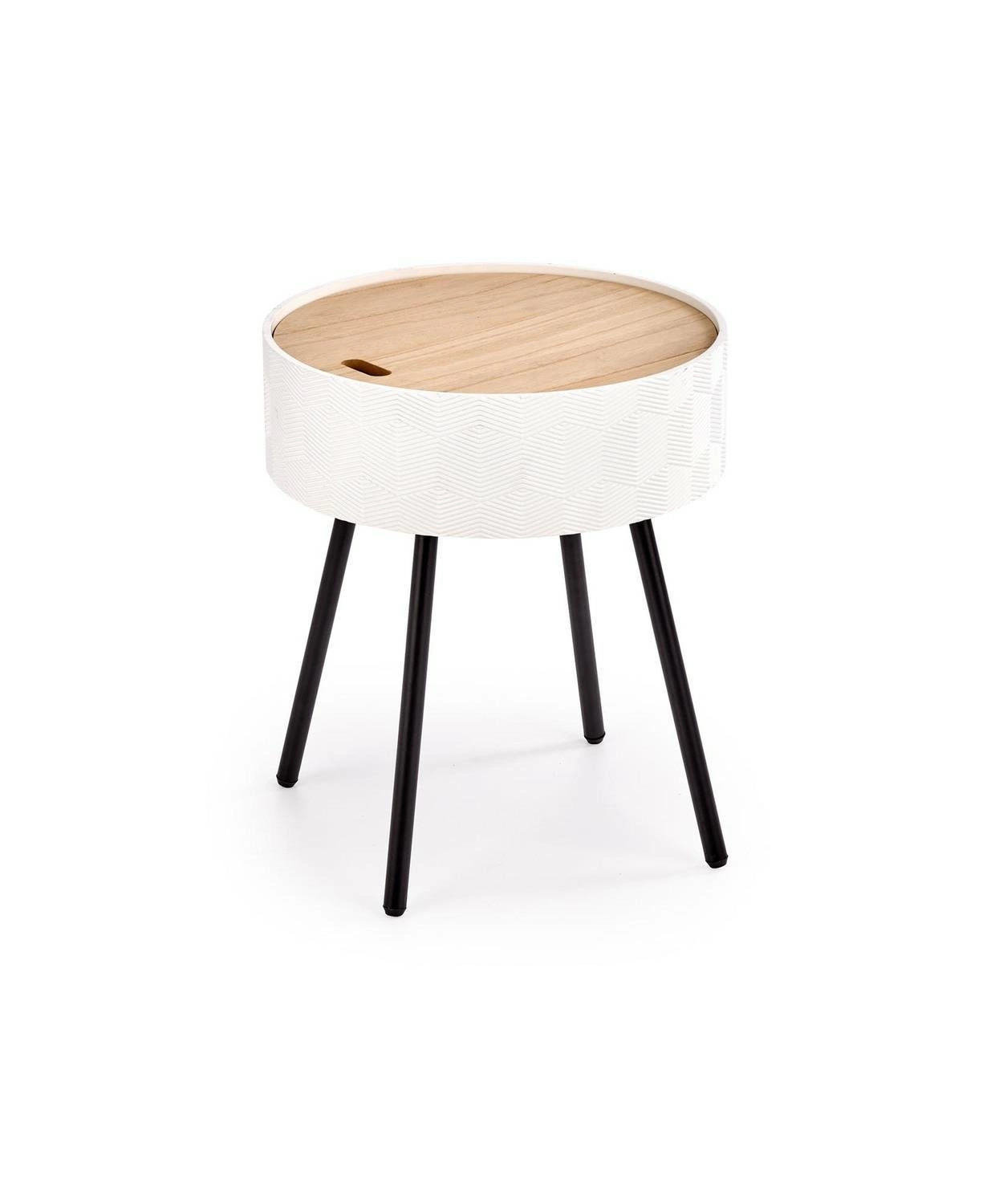 Wymiary blatu wynoszą 38/45 cm, co oznacza, że stolik jest wystarczająco duży, aby pomieścić kawę, herbatę, przekąski i wiele innych przedmiotów. Stelaż wykonany jest z metalu, który zapewnia stabilność i trwałość produktu. Stelaż dostępny jest w kolorze białym lub czarnym, co umożliwia dopasowanie go do każdego wnętrza.