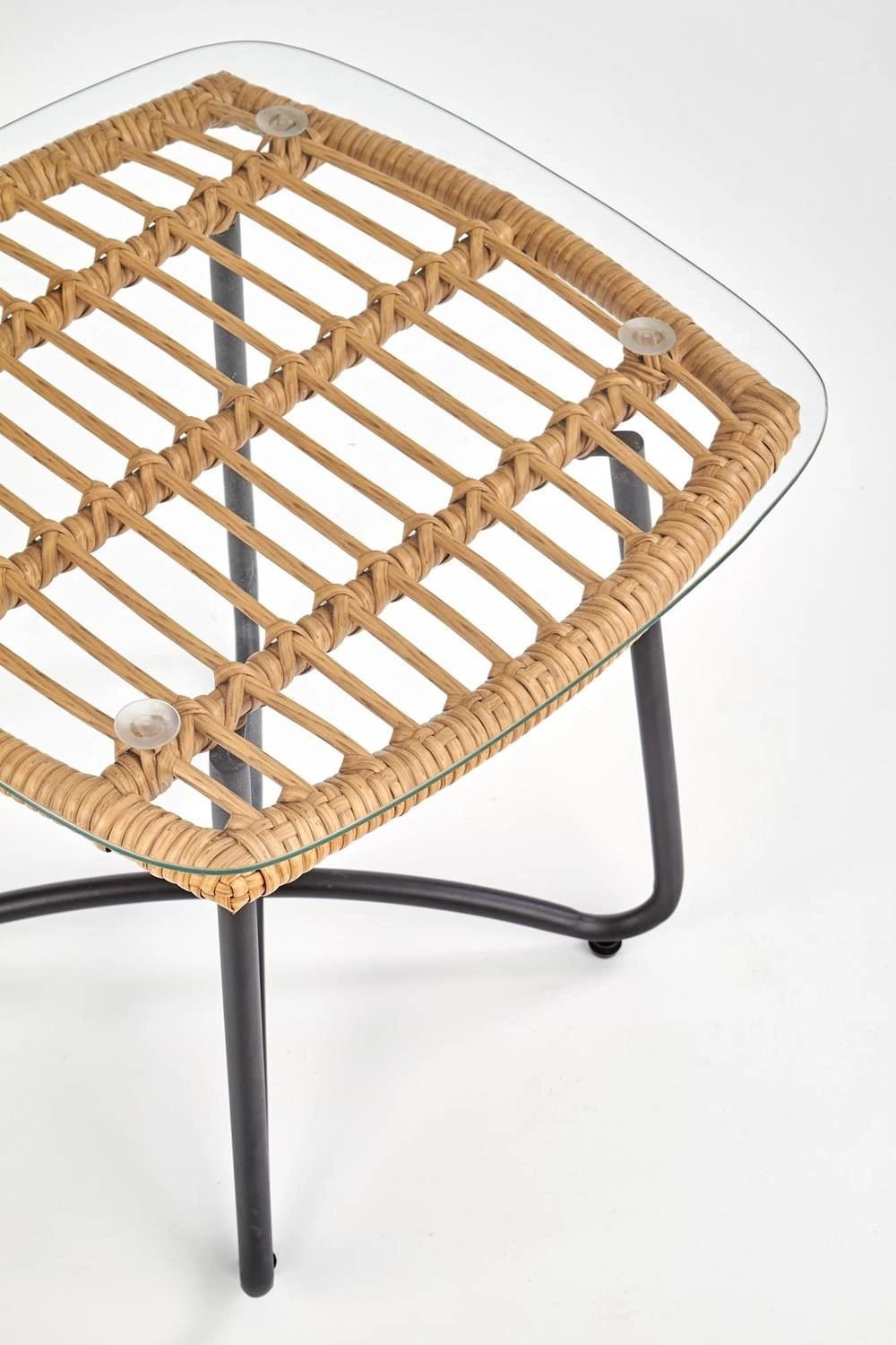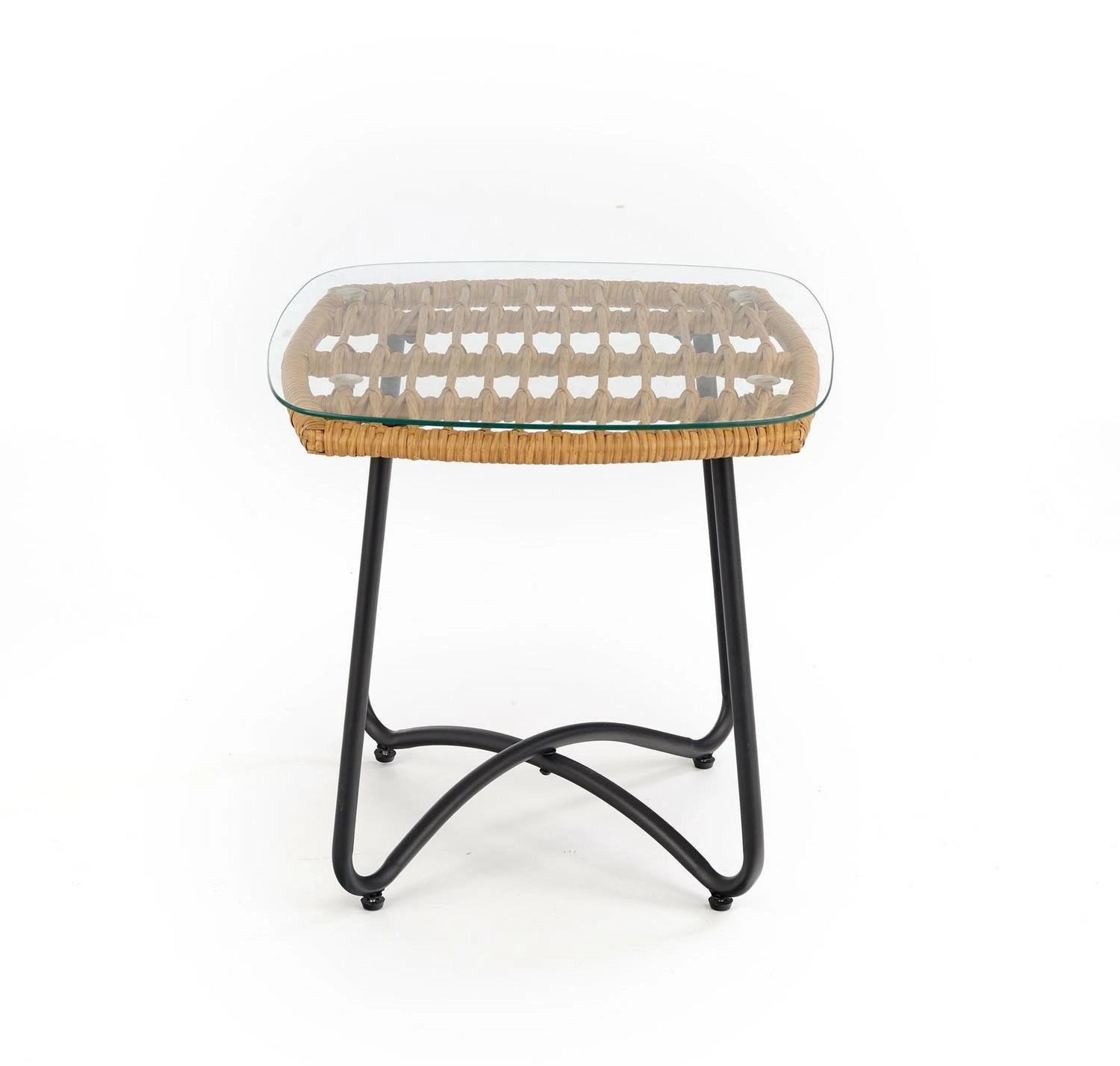 Jego kwadratowy blat wykonany z rattanu syntetycznego oraz szkła, dodaje mu wyjątkowego charakteru i sprawia, że stolik jest bardzo praktyczny. Blat szklany jest łatwy do utrzymania w czystości, a rattan syntetyczny dodaje ciepła i przytulności. Stelaż wykonany z metalu, malowanego proszkowo na kolor czarny, gwarantuje stabilność i wytrzymałość.